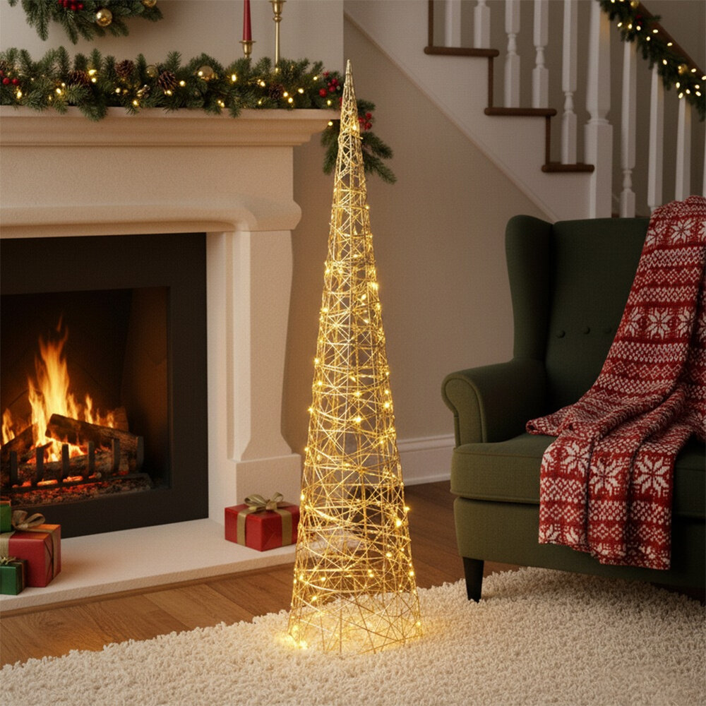 Świecąca choinka w kształcie stożka z lampkami LED w złotym kolorze to nowoczesna i elegancka dekoracja świąteczna. Do zastosowania wewnątrz pomieszczeń. Choinka prezentuje się bardzo efektownie, jest wyjątkowym elementem dekoracyjnym w okresie świąt Bożego Narodzenia. Możemy ustawić ją na komodzie, stoliku bądź szafce. Nada oryginalnego charakteru każdemu wnętrzu. Wyprodukowano zgodnie z europejskimi standardami.