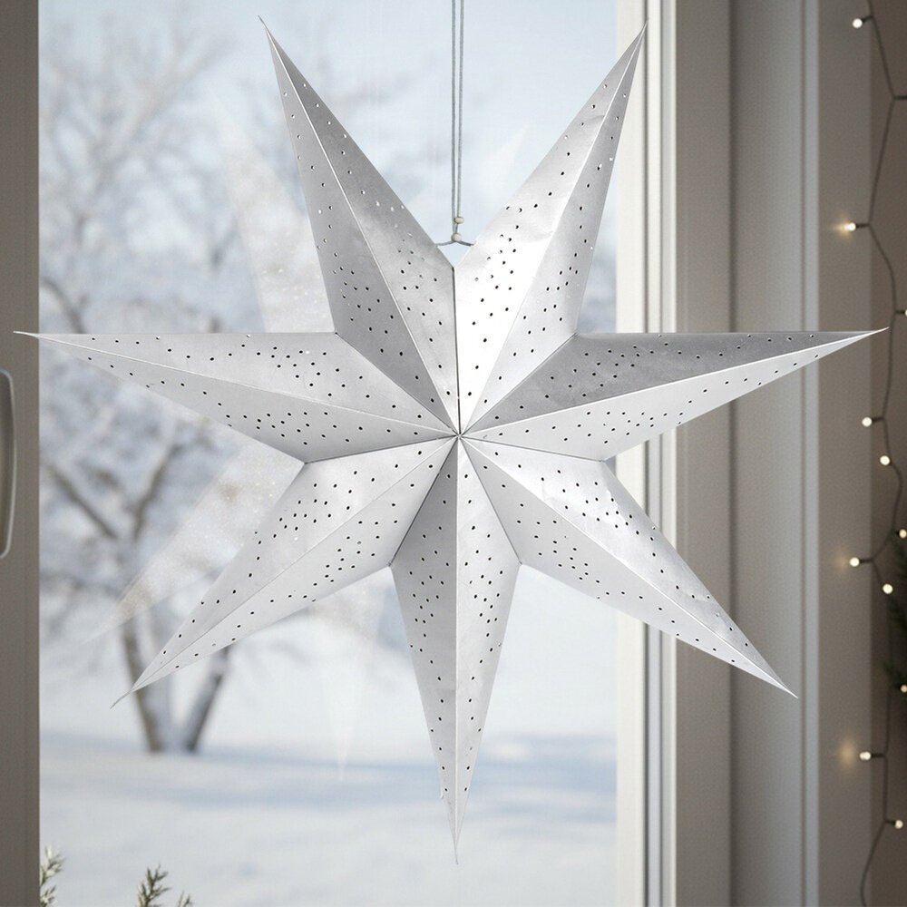 Duża, ażurowa gwiazda w srebrnym kolorze to stylowa i ekologiczna dekoracja świąteczna. Jej delikatny wzór i imponujący rozmiar sprawiają, że stanowi piękny, przyciągający wzrok akcent w każdym wnętrzu. To idealna ozdoba do stworzenia lekkiej, zimowej i magicznej atmosfery w domu nie tylko w okresie bożonarodzeniowym. Wyprodukowano zgodnie z europejskimi standardami.