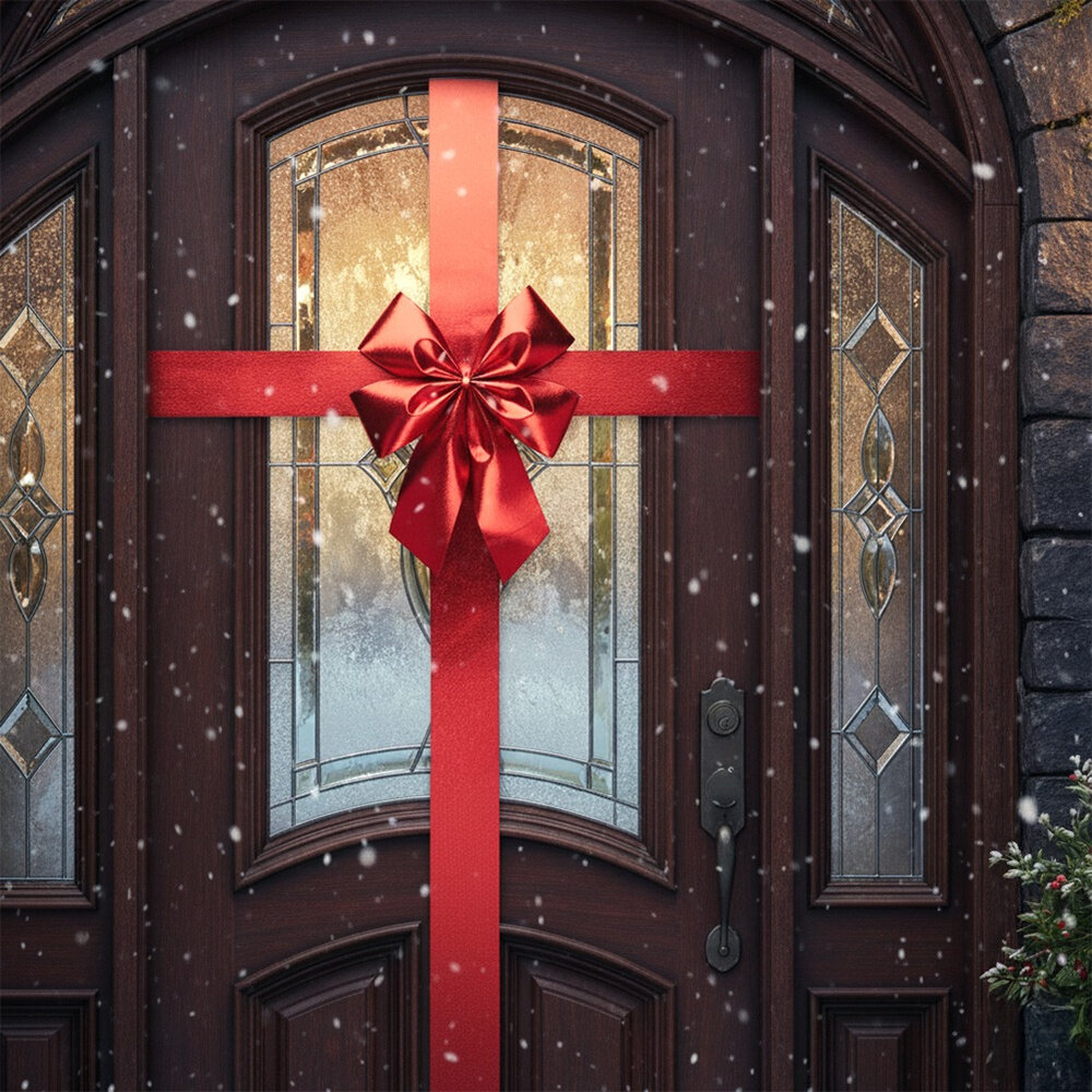 ✅ Długa wstążka do owinięcia drzwi - W komplecie znajduje się wstążka o długości 4,3 m, która pozwala na owinięcie standardowych drzwi wejściowych zarówno w pionie, jak i w poziomie, tworząc efekt zapakowanego prezentu.
