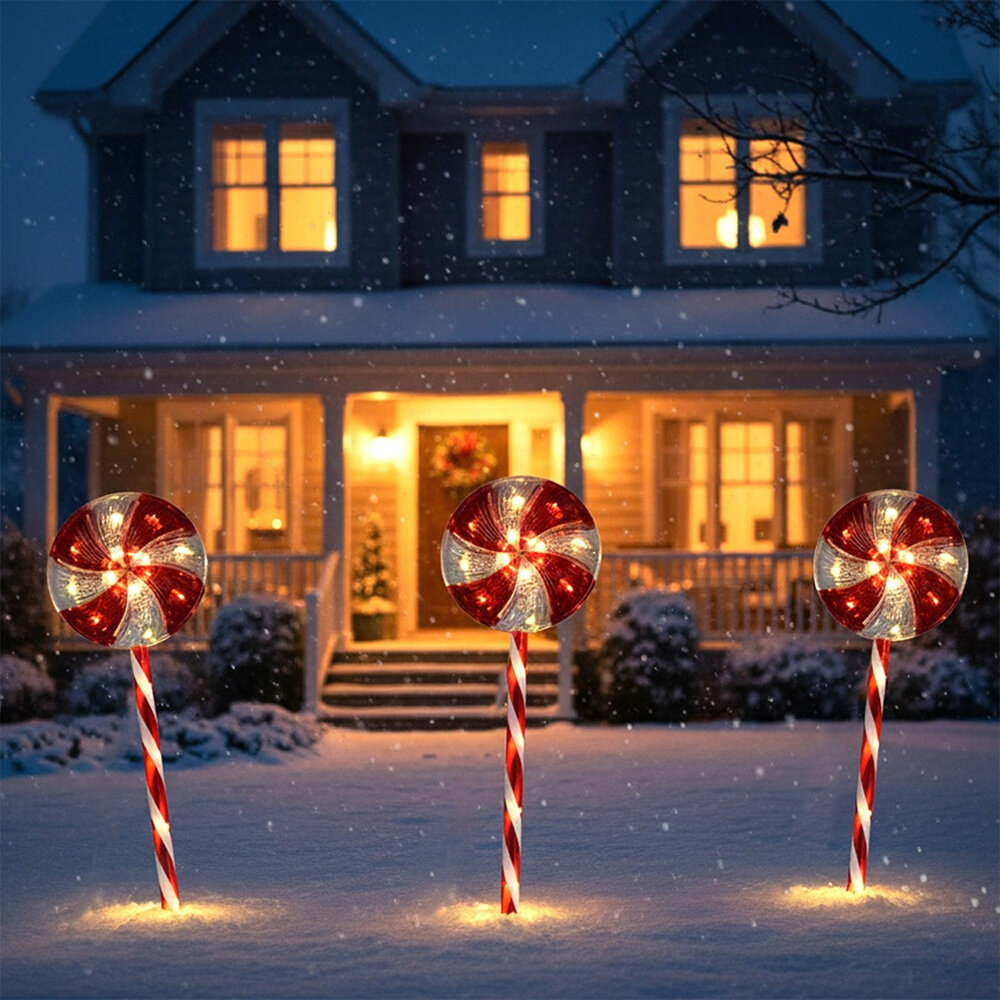 Zestaw 3 lampek ogrodowych LED w kształcie lizaków - Zestaw trzech lampek ogrodowych w formie świątecznych lizaków, każda o wysokości 62 cm. Wyposażone łącznie w 60 diod LED o ciepłej, białej barwie, stworzą magiczną i przytulną atmosferę w ogrodzie, na balkonie czy tarasie. Idealne do stworzenia świątecznej ścieżki świetlnej.