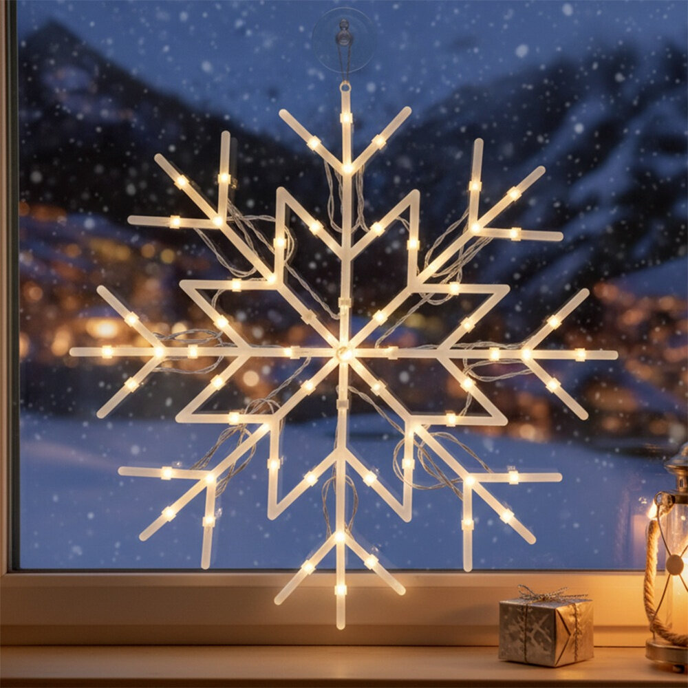 ✅ Świecąca ozdoba dekoracyjna na okno - Świąteczna dekoracja w kształcie płatka śniegu o wymiarach 35 x 35 cm, przeznaczona do zawieszenia na okno lub np. ścianę. Ozdoba jest podświetlana 24 diodami LED o ciepłej, białej barwie, tworząc elegancką, bożonarodzeniową atmosferę.