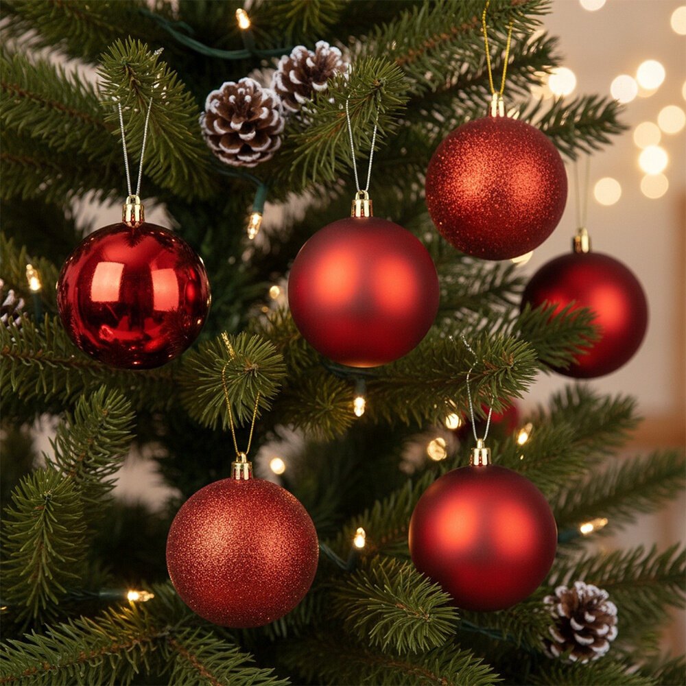 ✅ Zestaw 6 szt. bombek na choinkę - Zestaw 6 bombek w kolorze czerwonym, które dodadzą klasycznego blasku każdej choince i stworzą magiczną atmosferę w domu. W zestawie bombki: 2x matowe, 2x błyszczące i 2x brokatowe o średnicy 8 cm, które urozmaicą dekoracje na choince.