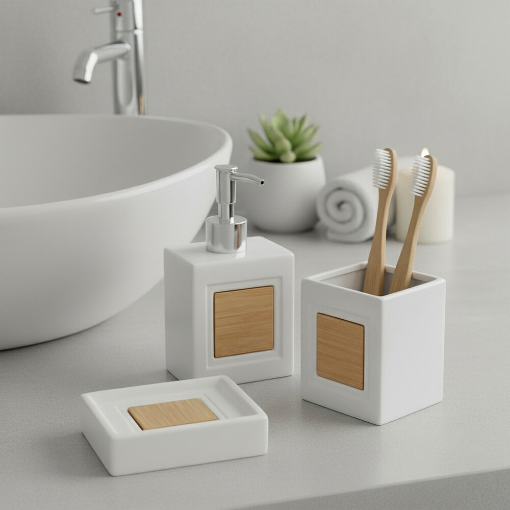Wykonany z dolomitu i bambusa - Wszystkie elementy zestawu wykonane są z trwałego dolomitu w białym kolorze i ozdobione naturalnym drewnem bambusowym. Połączenie tych materiałów nadaje całości elegancki, nowoczesny wygląd.