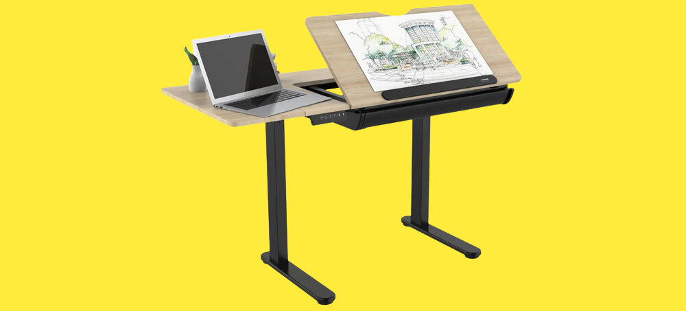 Wysokość biurka ET120 można dowolnie regulować, dopasowując ją do indywidualnych potrzeb czy wzrostu. Dzięki temu możesz pracować przy nim zarówno na siedząco, jak i na stojąco. Elektryczna regulacja wysokości w zakresie 73 - 123 cm to ogromny atut tego niepozornego mebla! Co więcej, część blatu biurka kreślarskiego od Tuckano można pochylać pod kątem 40 stopni, aby ułatwić sobie prace nad rysunkiem. Na części bez regulacji może w tym czasie stać laptop lub inne akcesorium niezbędne do tworzenia nowych prac.