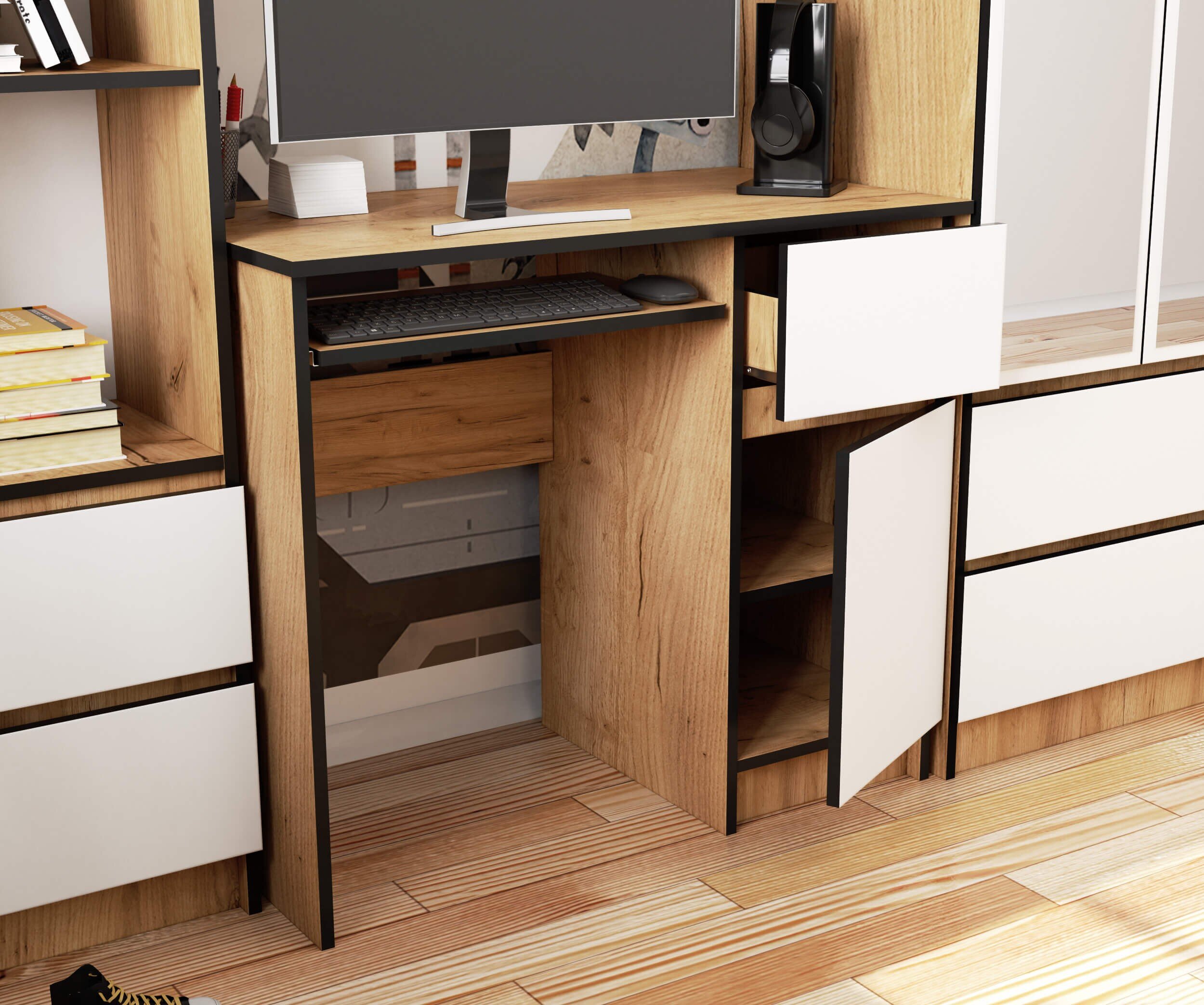 Biurko komputerowe PIKSEL o szerokości 90 cm to niewielki model, który idealnie sprawdza się do małego pokoju młodzieżowego lub domowego biura. Ten mebel wyróżnia się wysoką funkcjonalnością. Wyposażony jest w praktyczną półkę na klawiaturę, szufladę oraz szafkę z 2 wewnętrznymi półkami. Doskonały wybór do stylowych przestrzeni! Biurko to ważny element każdego pokoju dziecięcego. Zapewnia komfort pracy, nauki i rozrywki, co jest istotne dla osób spędzających przy nim sporo czasu. Dobrze skonstruowane biurko powinno być ergonomiczne, funkcjonalne i estetyczne, a także wykonane z trwałych materiałów odpornych na codzienne użytkowanie. Biurka AKORD łączą wygodę i styl, oferując prosty, a jednocześnie nowoczesny design, który pasuje do każdego wnętrza. Dzięki przemyślanemu wykonaniu doskonale odpowiadają na potrzeby użytkowników, zapewniając zadowolenie przez wiele lat. To idealne rozwiązanie dla osób ceniących trwałość i elegancję w jednym.