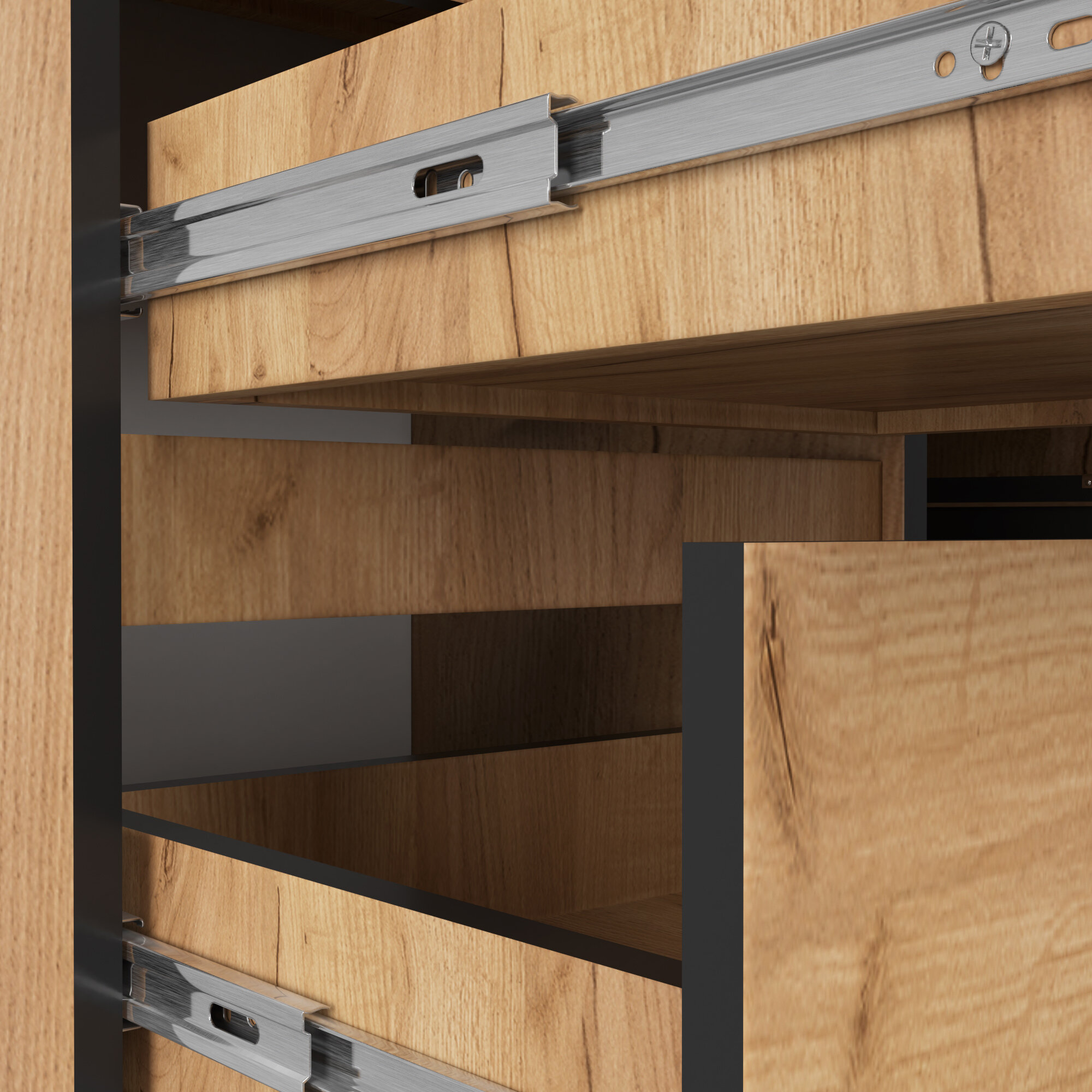 Biurko narożne B20 to idealne rozwiązanie do biura, domowego gabinetu lub pokoju nastolatka. Z nowoczesnym designem i funkcjonalnym układem, oferuje dużą przestrzeń do przechowywania dzięki trzem szufladom, zamykanej szafce, czterem półkom oraz obszernemu blatowi. Narożne biurko umożliwia wygodną organizację dokumentów, akcesoriów biurowych i sprzętu elektronicznego. Wykonane z laminowanej płyty o grubości 16 mm (Kronospan), biurko charakteryzuje się trwałością i odpornością na ścieranie. Krawędzie zabezpieczono obrzeżem ABS, co zwiększa odporność na uszkodzenia mechaniczne. Szuflady poruszają się płynnie na metalowych prowadnicach wysokiej jakości, co zapewnia wygodę użytkowania. Model dostępny jest w wersji lewej i prawej, co pozwala dostosować go do układu pomieszczenia. Narożne biurko AKORD B20 doskonale sprawdzi się w różnorodnych wnętrzach, łącząc praktyczność z estetyką. Biurko to ważny element każdego domowego biura. Zapewnia komfort pracy, nauki i rozrywki, co jest istotne dla osób spędzających przy nim dużo czasu. Dobrze skonstruowane biurko powinno być ergonomiczne, funkcjonalne i estetyczne, a także wykonane z trwałych materiałów odpornych na codzienne użytkowanie. Biurka AKORD łączą wygodę i styl, oferując prosty, a jednocześnie nowoczesny design, który pasuje do każdego wnętrza. Dzięki przemyślanemu wykonaniu doskonale odpowiadają na potrzeby użytkowników, zapewniając satysfakcję przez wiele lat. To idealne rozwiązanie dla osób ceniących trwałość i elegancję w jednym.