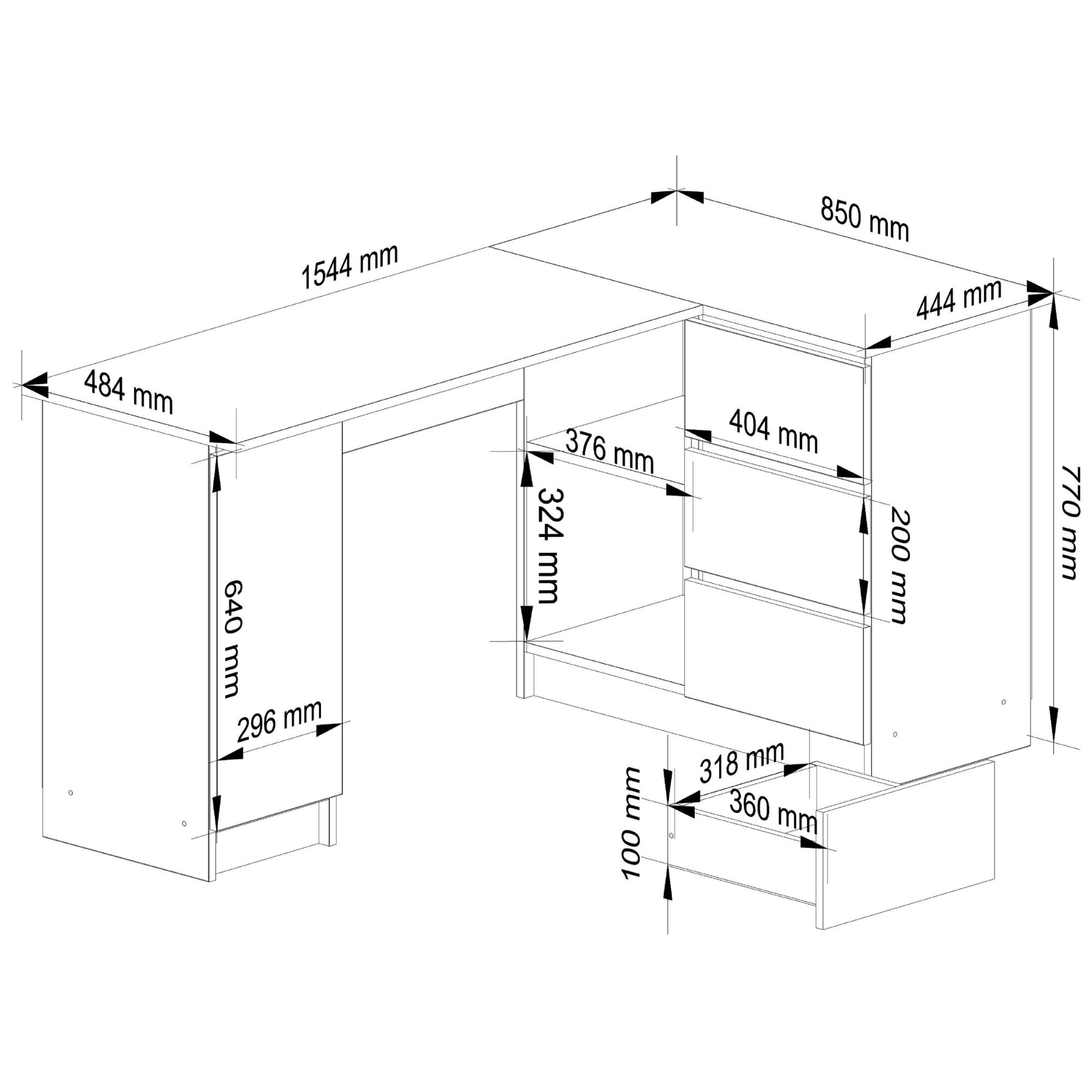- PÓŁKA PO LEWEJ LUB PRAWEJ STRONIE: Przy zakupie biurka narożnego można wybrać wariant z półkami i szufladami po lewej lub prawej stronie. Jeśli wybierzesz wariant z szufladą i półką po lewej stronie, schowek z drzwiami znajduje się po prawej stronie.