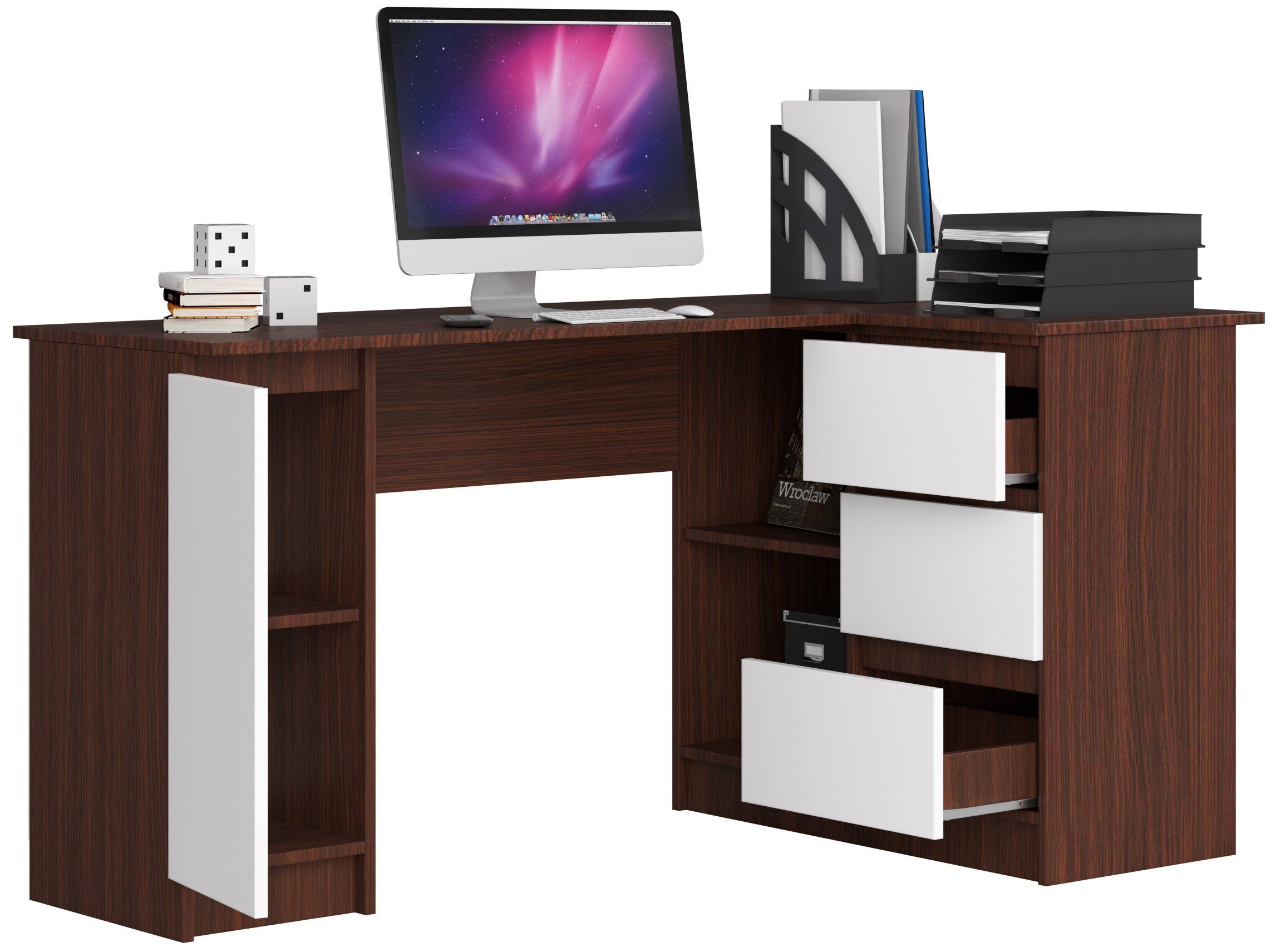 - Biurko narożne AKORD B20 Wenge 155 cm prawe 1 drzwi 3 szuflady kolor Biały mat 4 półki 155x85x77 cm