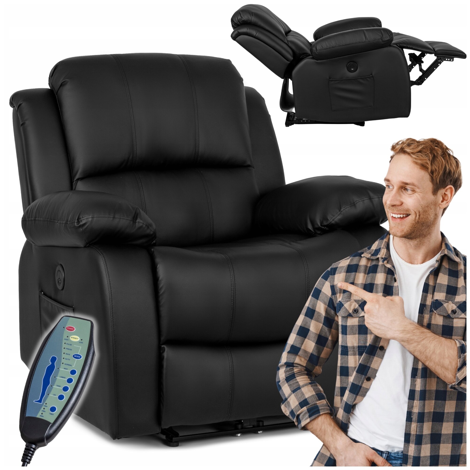 - Fotel Masujący Elektryczny Rozkładany Wypoczynkowy Ekoskóra Czarny BONO