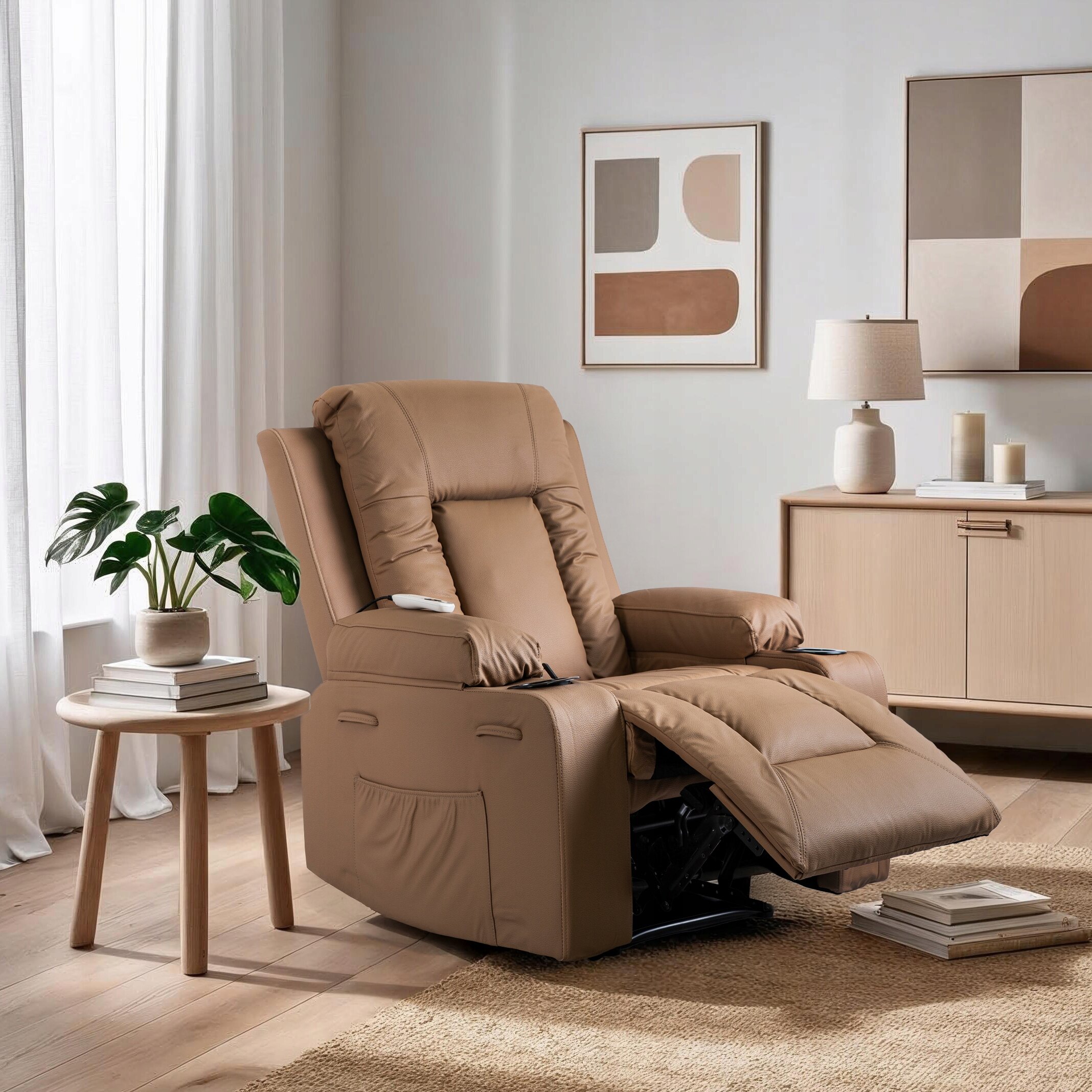 Fotel BOX to doskonałe połączenie nowoczesnego designu z wygodą. Jest rozkładany do pozycji półleżącej i posiada sterowaną pilotem funkcję masażu. Ma wypełnienie z grubej warstwy pianki tapicerskiej, więc jest miękki i siedzi bądź leży się w nim naprawdę komfortowo. Fotel pokryty jest wysokiej jakości skórą ekologiczną w karmelowym kolorze, która dodaje elegancji.