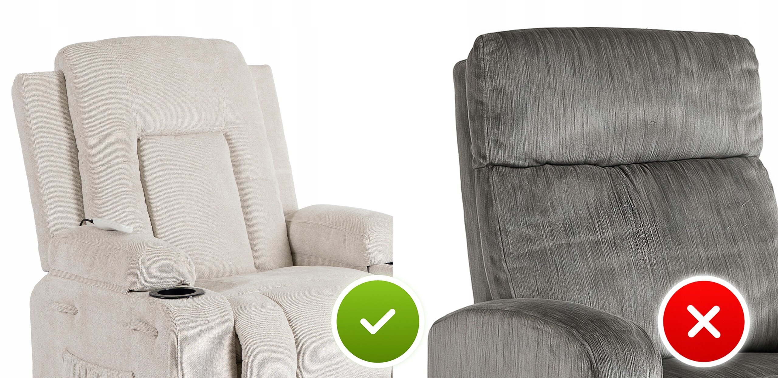 Po prawej natomiast widoczny jest przykład tańszego odpowiednika – tkanina niskiej jakości szybko się odkształca, płowieje i traci swój pierwotny wygląd. Materiał ulega przetarciom, traci fakturę i staje się nieestetyczny. Taki fotel traci nie tylko swój urok, ale też wygodę.