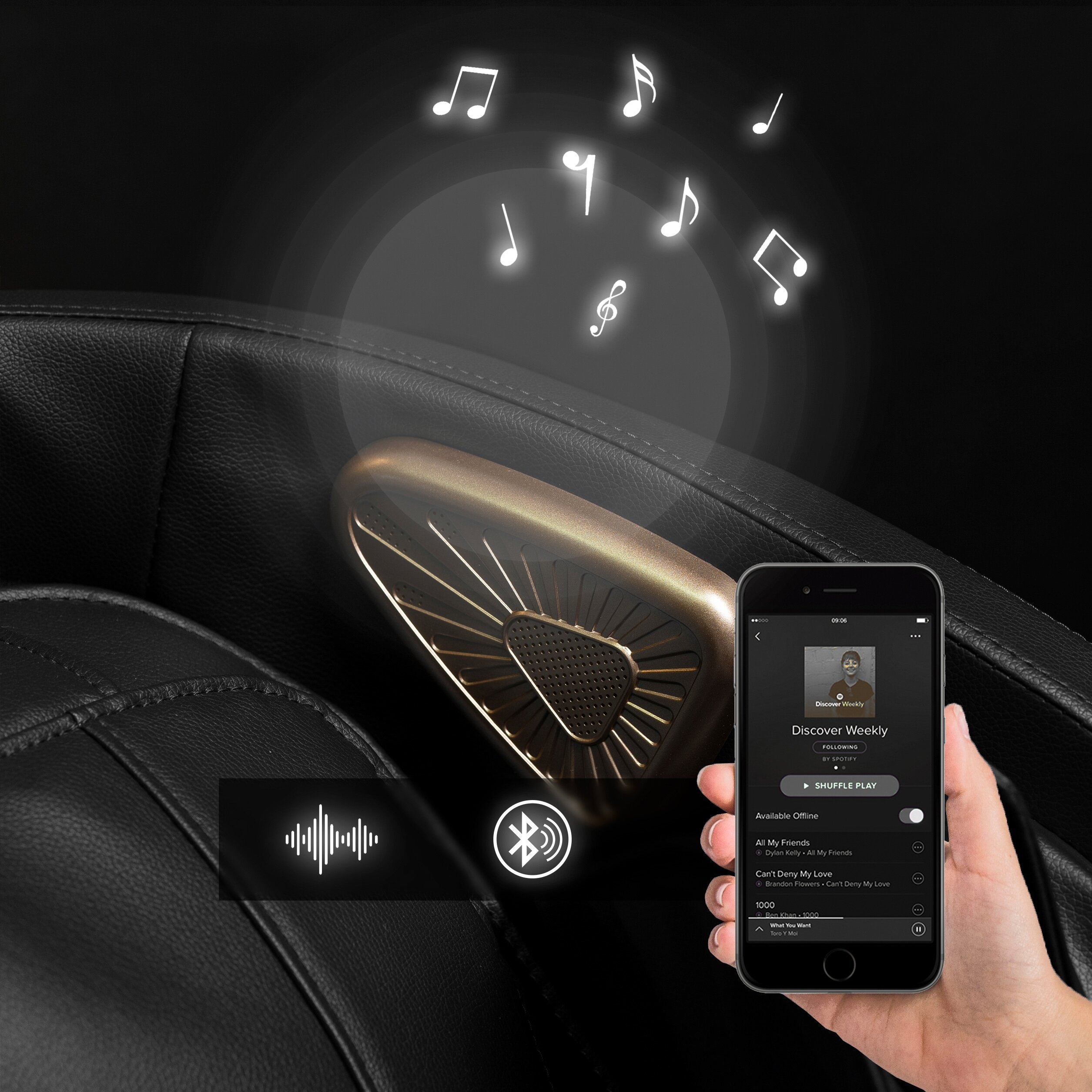 Dzięki wbudowanym głośnikom wraz z systemem Bluetooth możesz połączyć się ze swoim telefonem i odprężyć się przy swoich ulubionych piosenkach. Muzyczna terapia, dodaje kolejny wymiar relaksowi, tworząc chwile wewnętrznego spokoju.