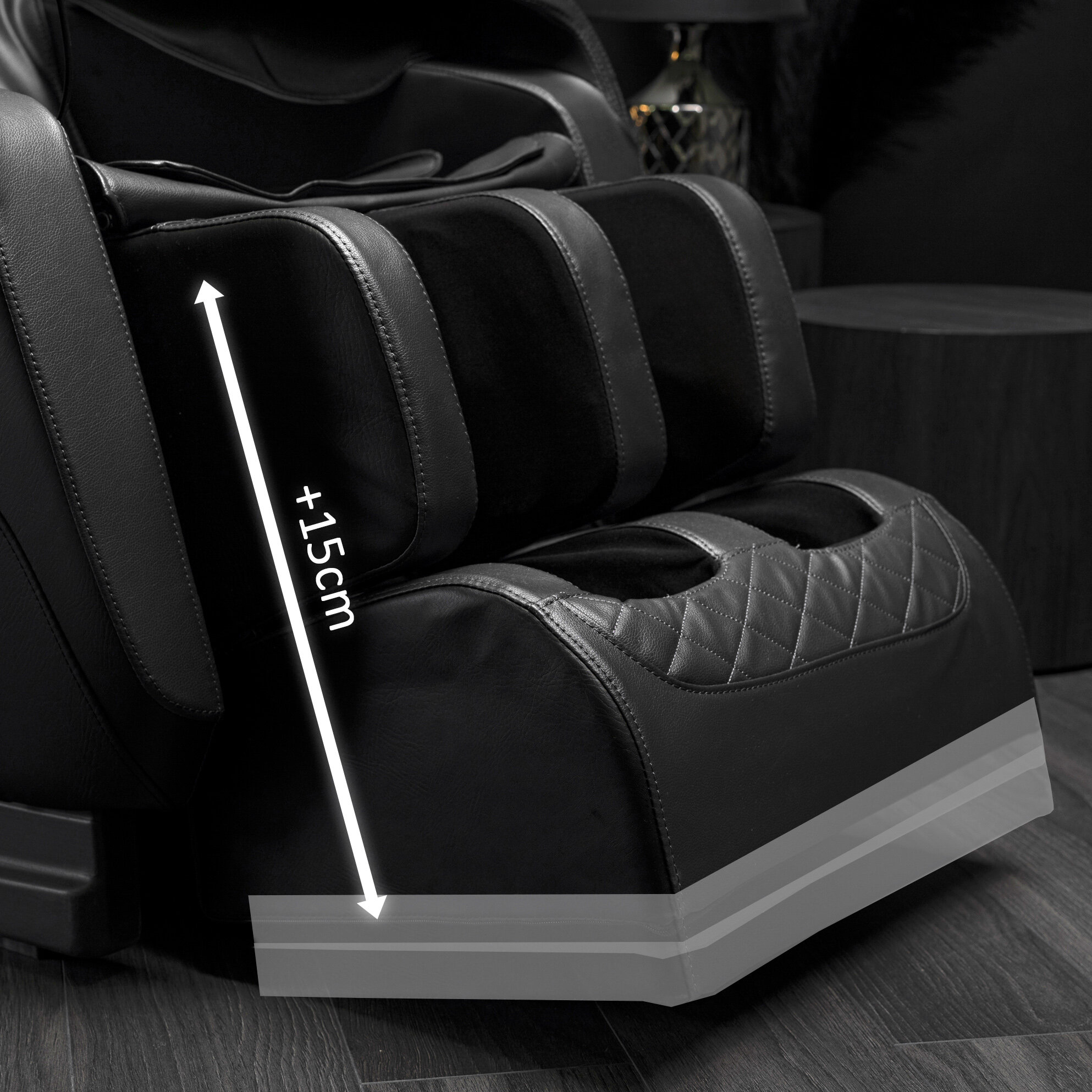 Po ciężkim dniu zazwyczaj nasze łydki i stopy wymagają specjalnej uwagi. W zależności od wzrostu czy też długości nóg, część masująca kolana jest elektrycznie regulowana co do swojej pozycji. Nasz fotel oferuje masaż limfatyczny łydek w technice kompresji powietrznej oraz rolkowy masaż podeszwy stóp połączony z uciskiem poduszkami. Dzięki takiej terapii połączonej z możliwością dopasowania długości całego podnóżka, Twoje obolałe i opuchnięte nogi dostaną to na co zasługują: luksusowe spa na koniec dnia!