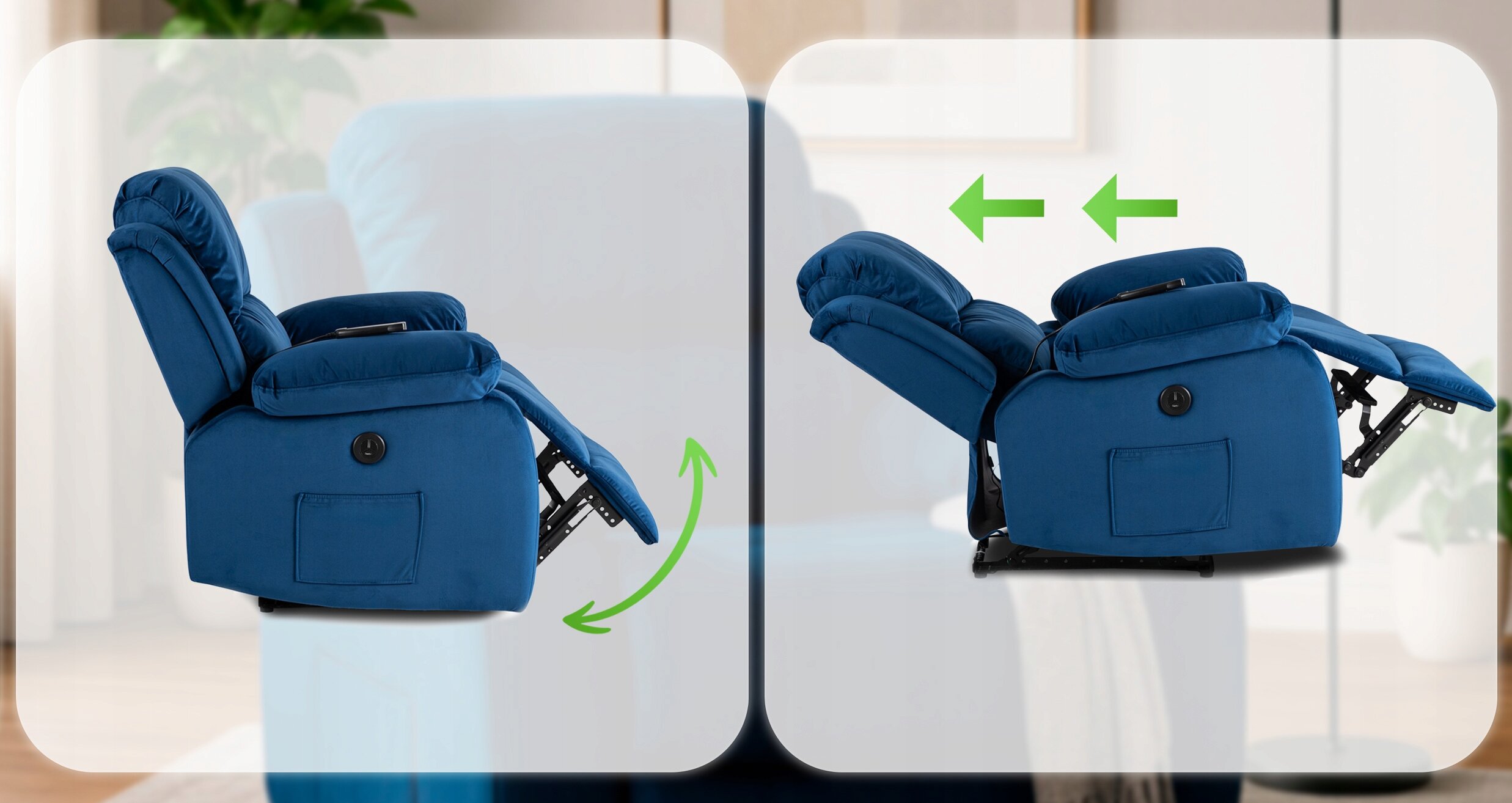 - Rozkładane oparcie i wysuwany podnóżek – wygodny wypoczynek w pozycji siedzącej, półleżącej lub leżącej.