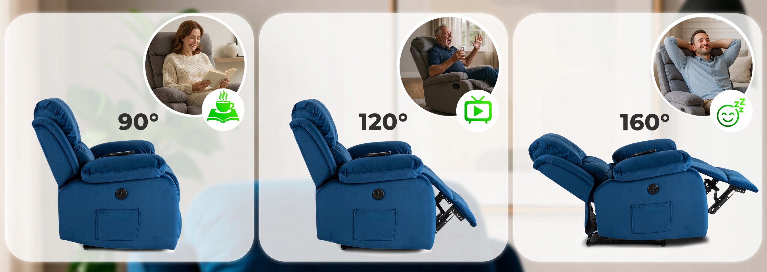 - 3 poziomy relaksu – 90° do czytania i picia kawy, 120° do oglądania telewizji oraz 160° do drzemki.