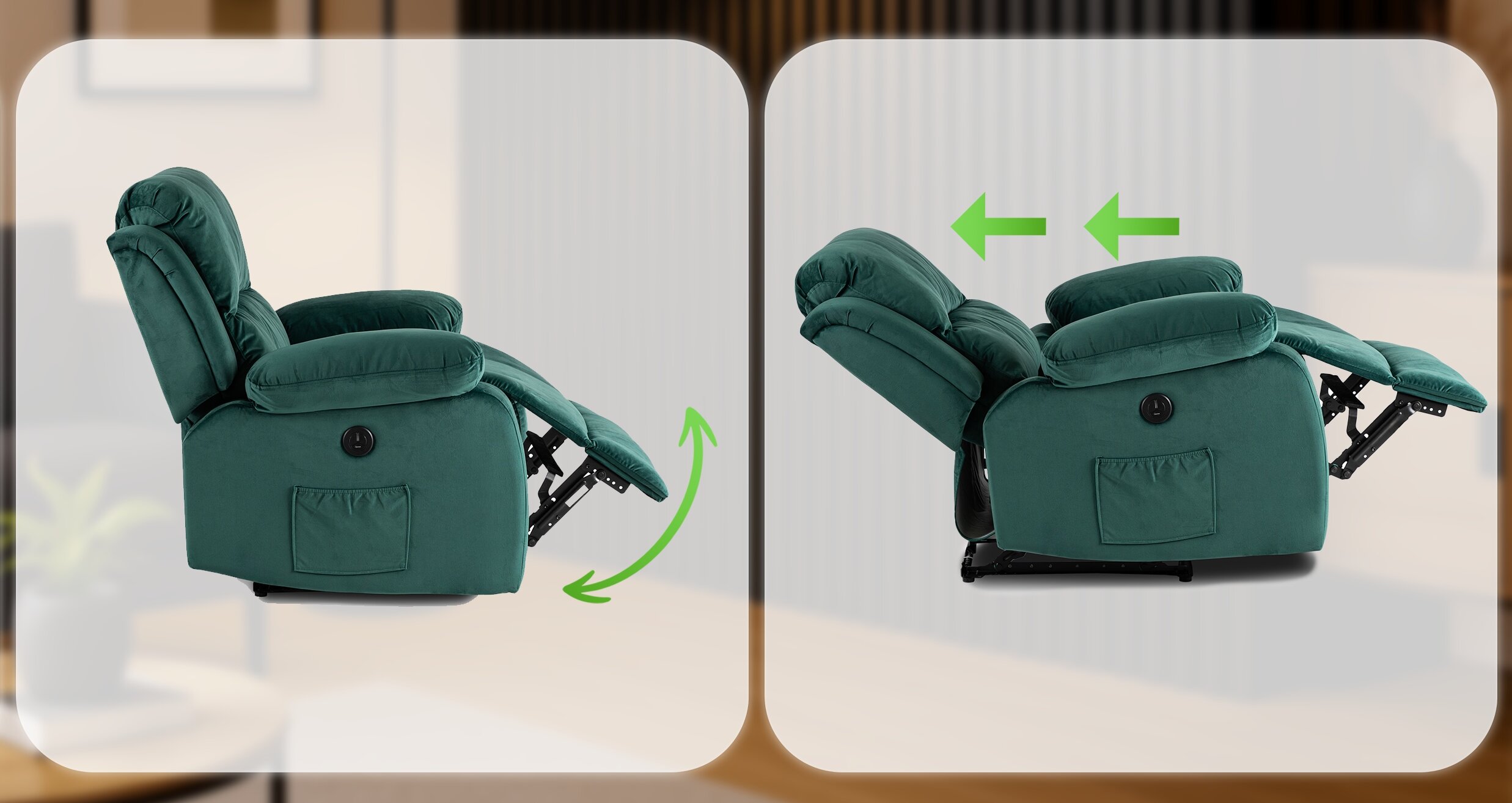 - Rozkładane oparcie i wysuwany podnóżek – wygodny wypoczynek w pozycji siedzącej, półleżącej lub leżącej.