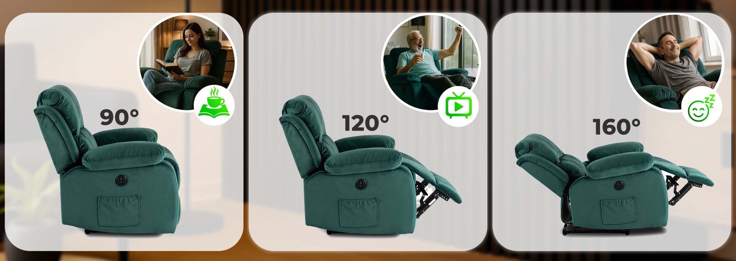 - 3 poziomy relaksu – 90° do czytania i picia kawy, 120° do oglądania telewizji oraz 160° do drzemki.