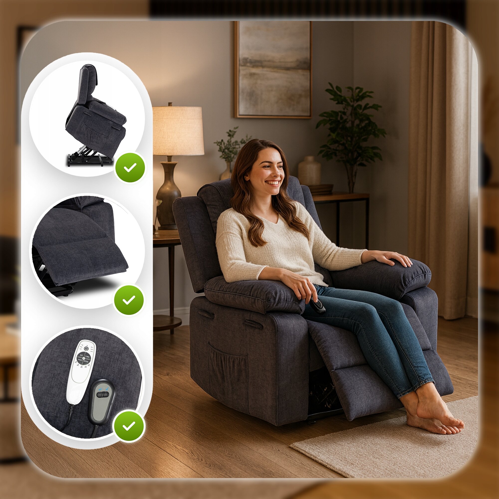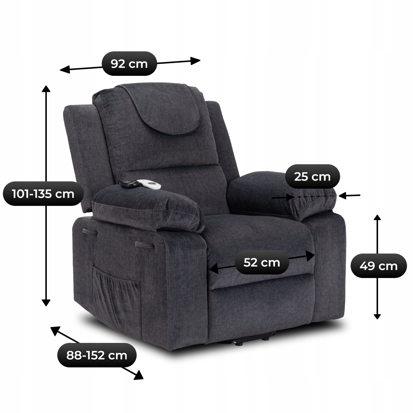 - Funkcja wspomagająca wstawanie – mechanizm podnoszący ułatwia bezpieczne i wygodne podniesienie się z fotela, szczególnie dla osób starszych.