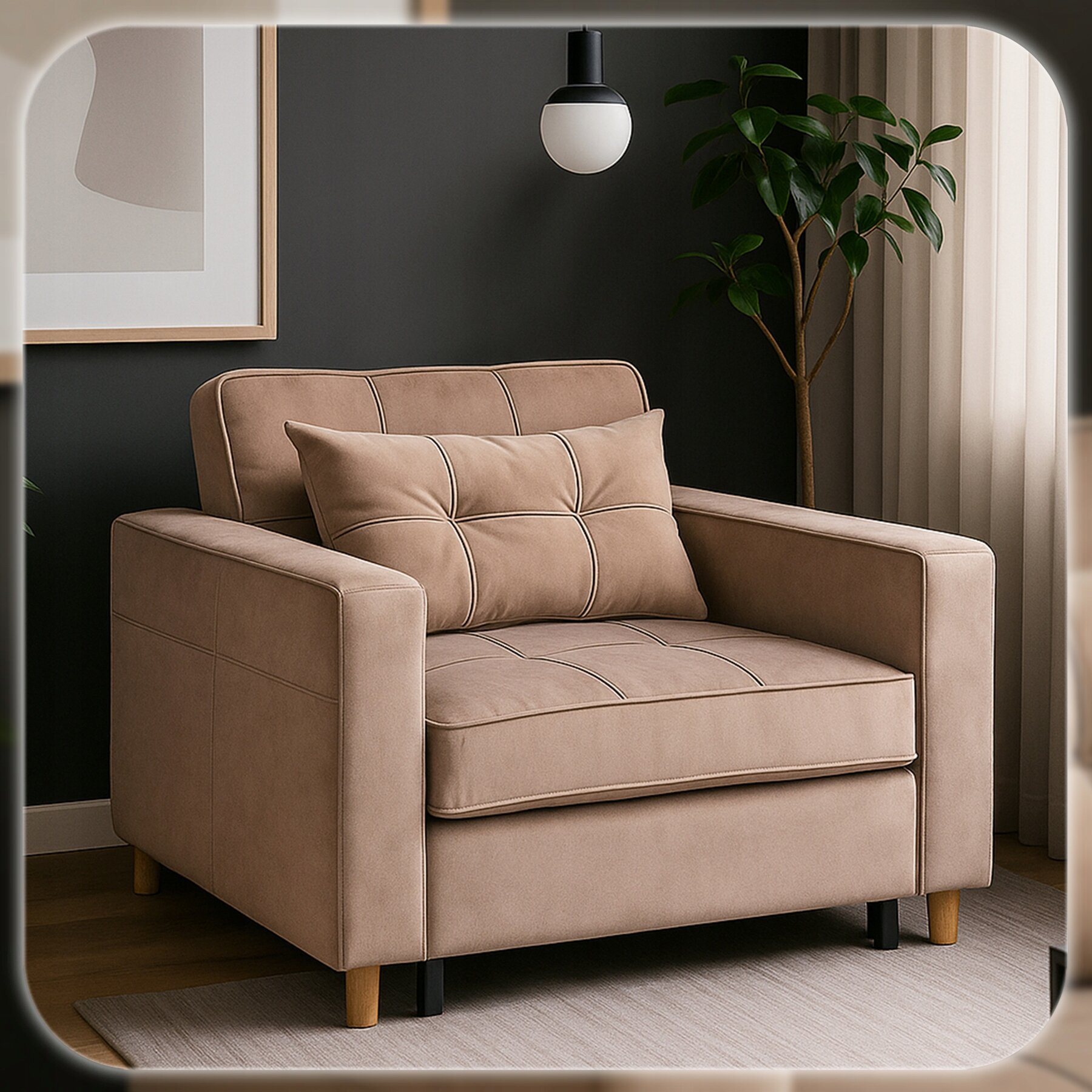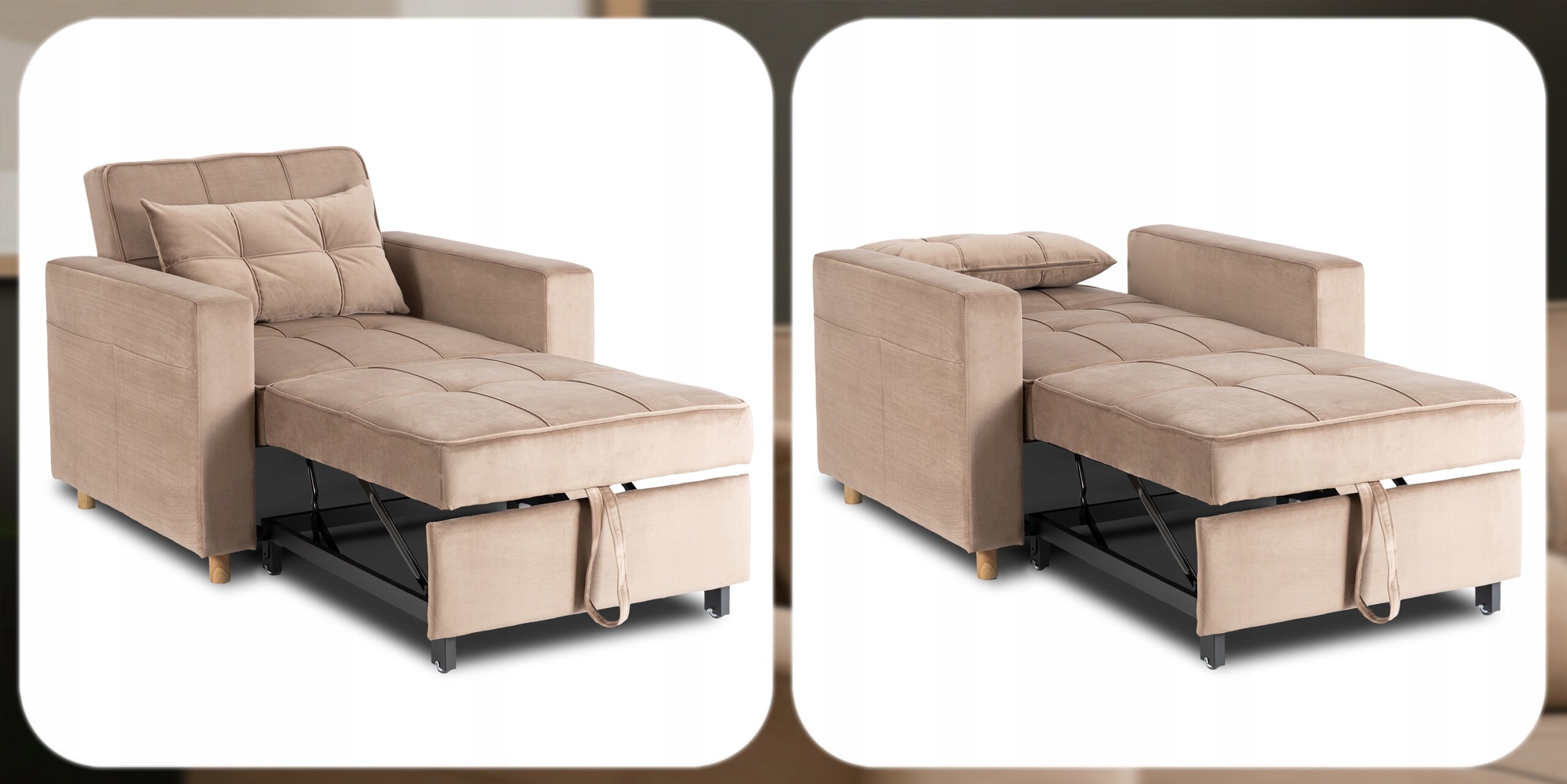 Ten fotel rozkładany łączy elegancję z funkcjonalnością – w kilka chwil zmienia się w wygodne łóżko. Świetnie sprawdzi się w salonie, sypialni, pokoju gościnnym, a także w hotelach.