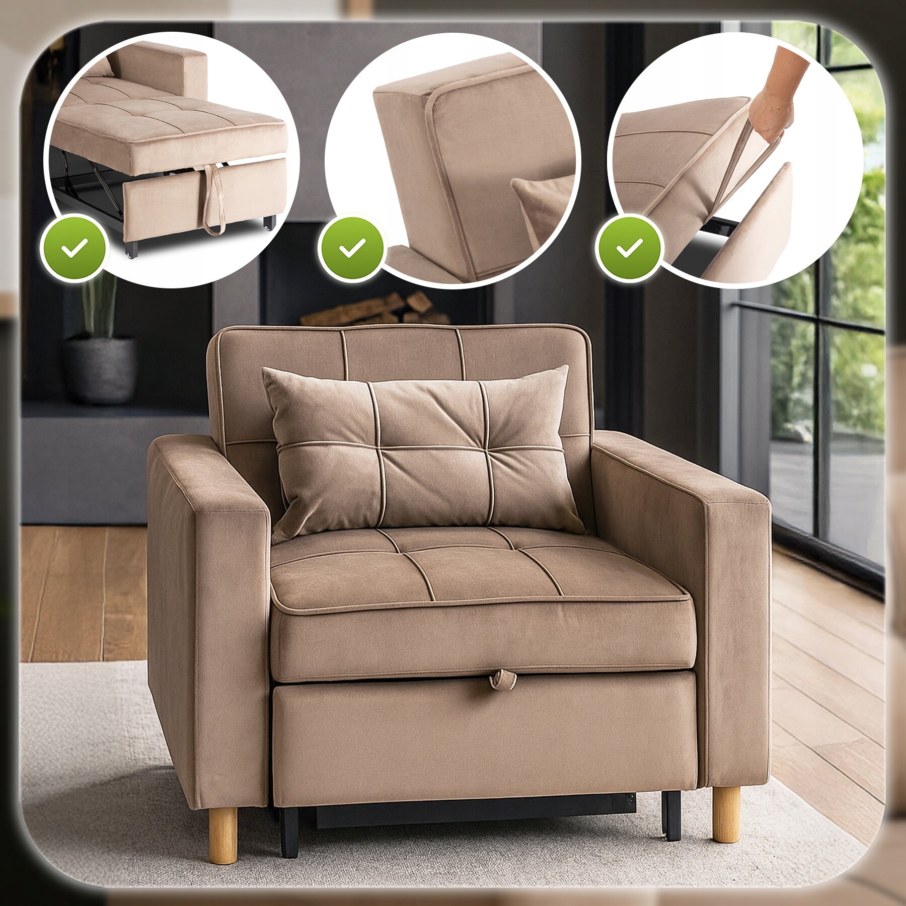 ✨ Amerykanka Fotel Rozkładany Sofa Kanapa Do Spania Wypoczynkowy Beżowy SOLOR 2