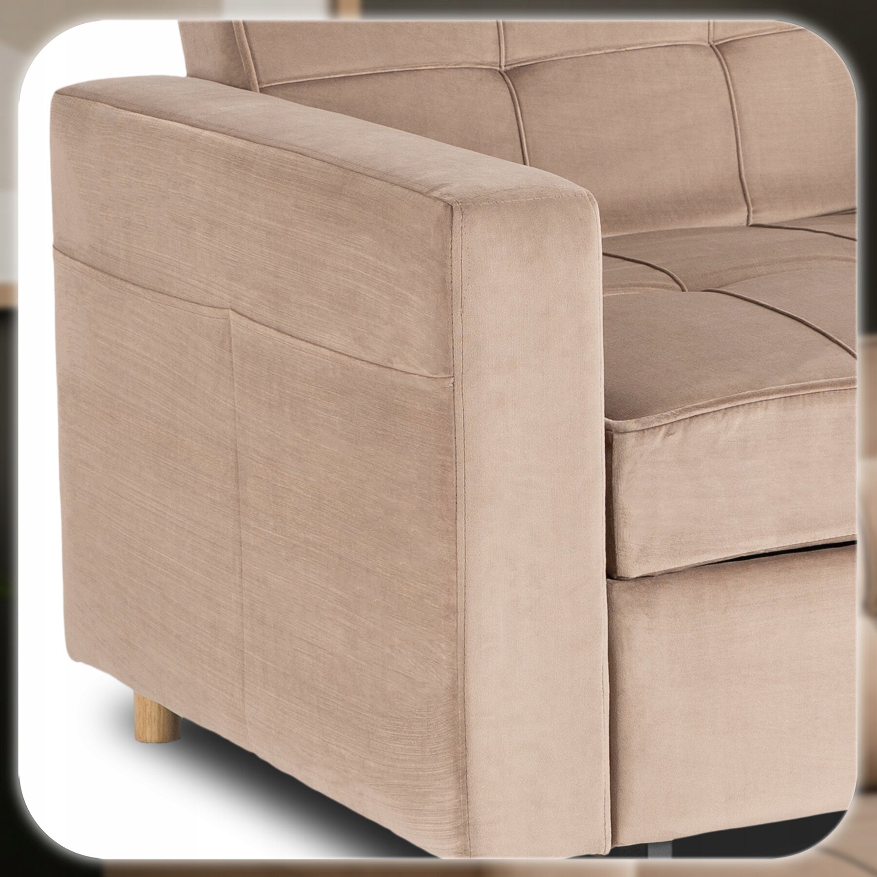 - Wytrzymała tapicerka welurowa – tkanina odporna na mechacenie i przetarcia, a jednocześnie miękka i przyjemna w dotyku, co gwarantuje komfort codziennego użytkowania.