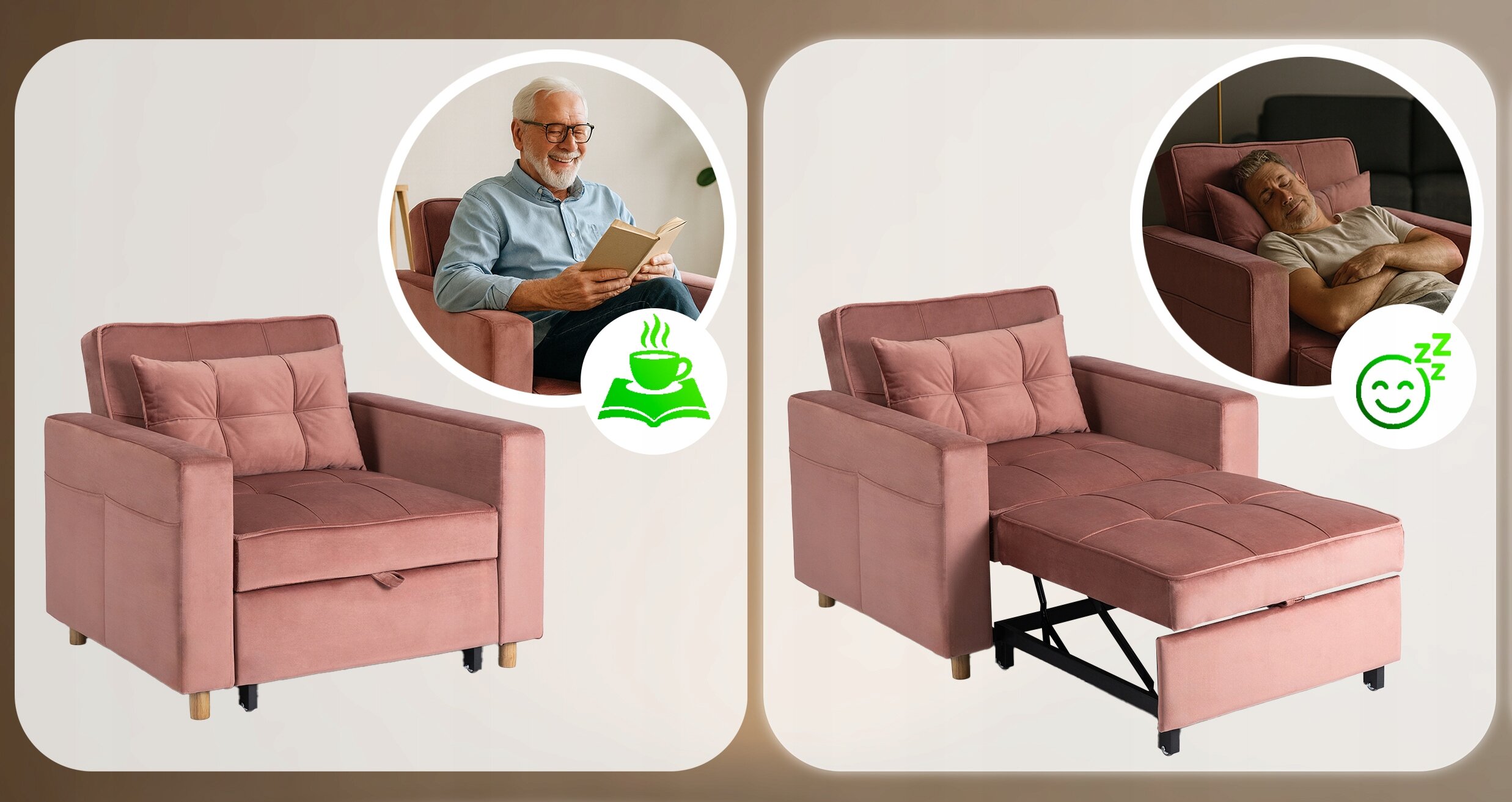 - W kawalerce lub małym mieszkaniu – oszczędza przestrzeń, łącząc trzy funkcje w jednym: fotel, leżankę i łóżko.