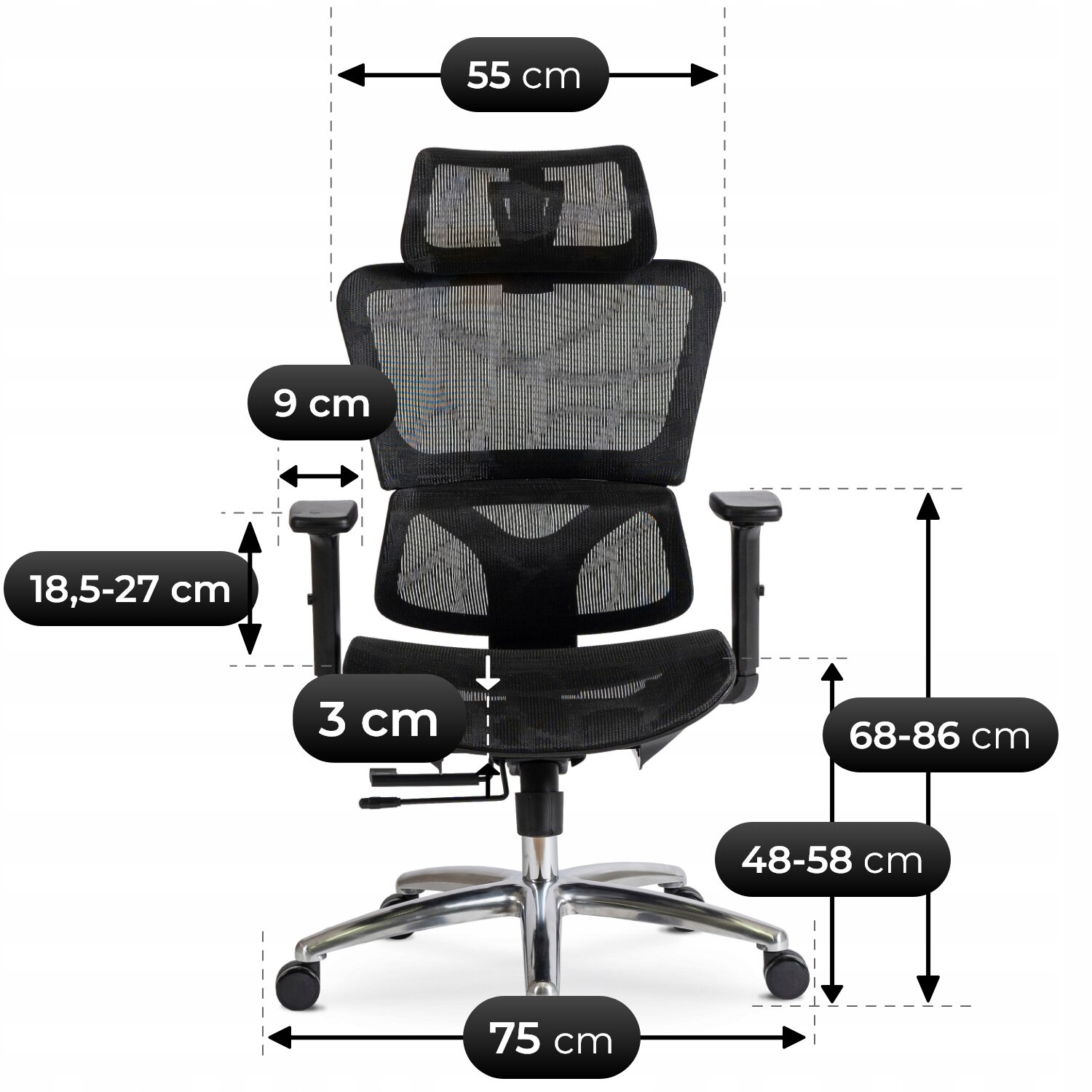 - Zakres regulacji podłokietników (wysokość): 18,5 – 27 cm