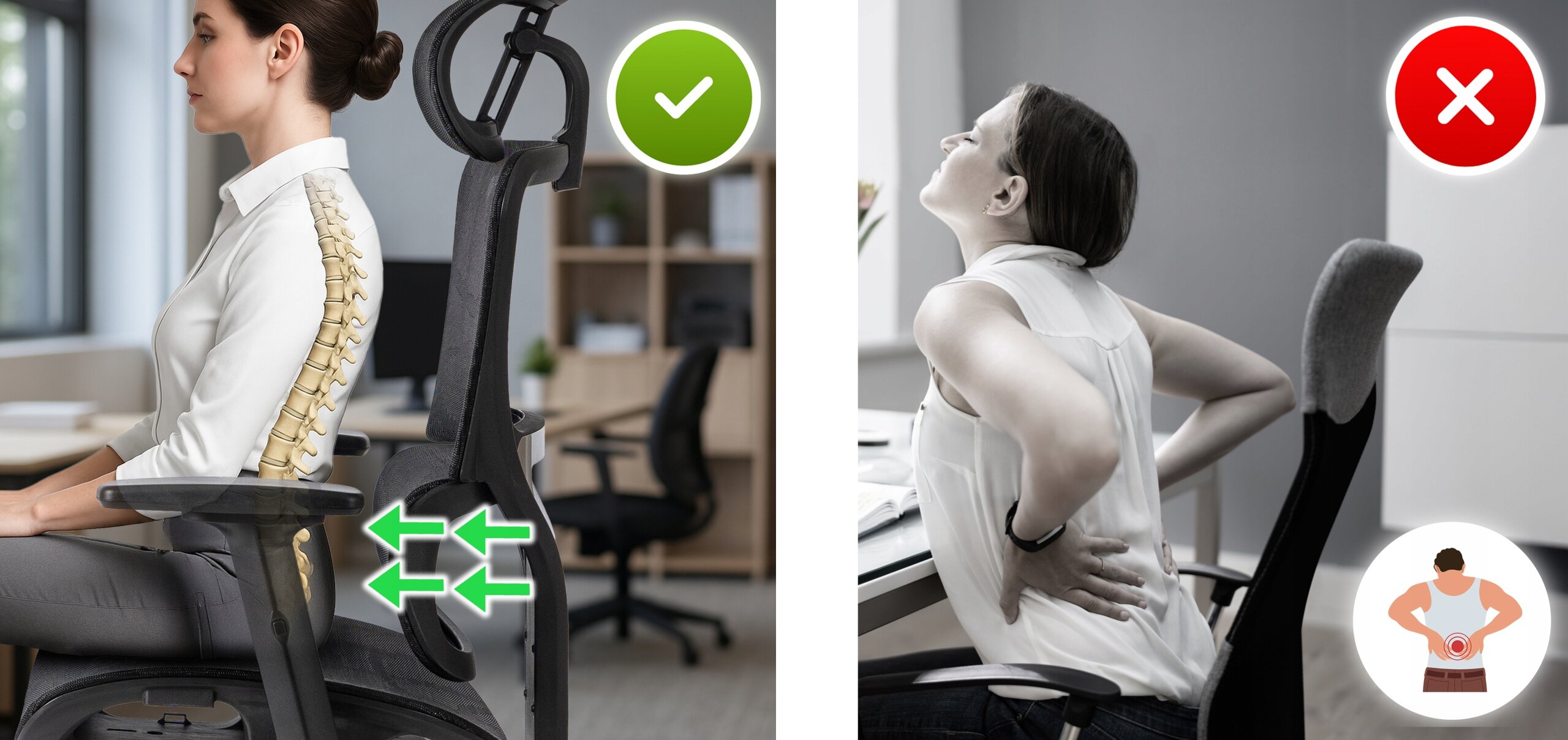 Zintegrowane podparcie lędźwiowe działa aktywnie – delikatnie podtrzymuje dolną część pleców, nie dopuszczając do zapadania się sylwetki. To szczególnie ważne przy siedzącym trybie życia, który obciąża mięśnie posturalne i sprzyja powstawaniu wad postawy.