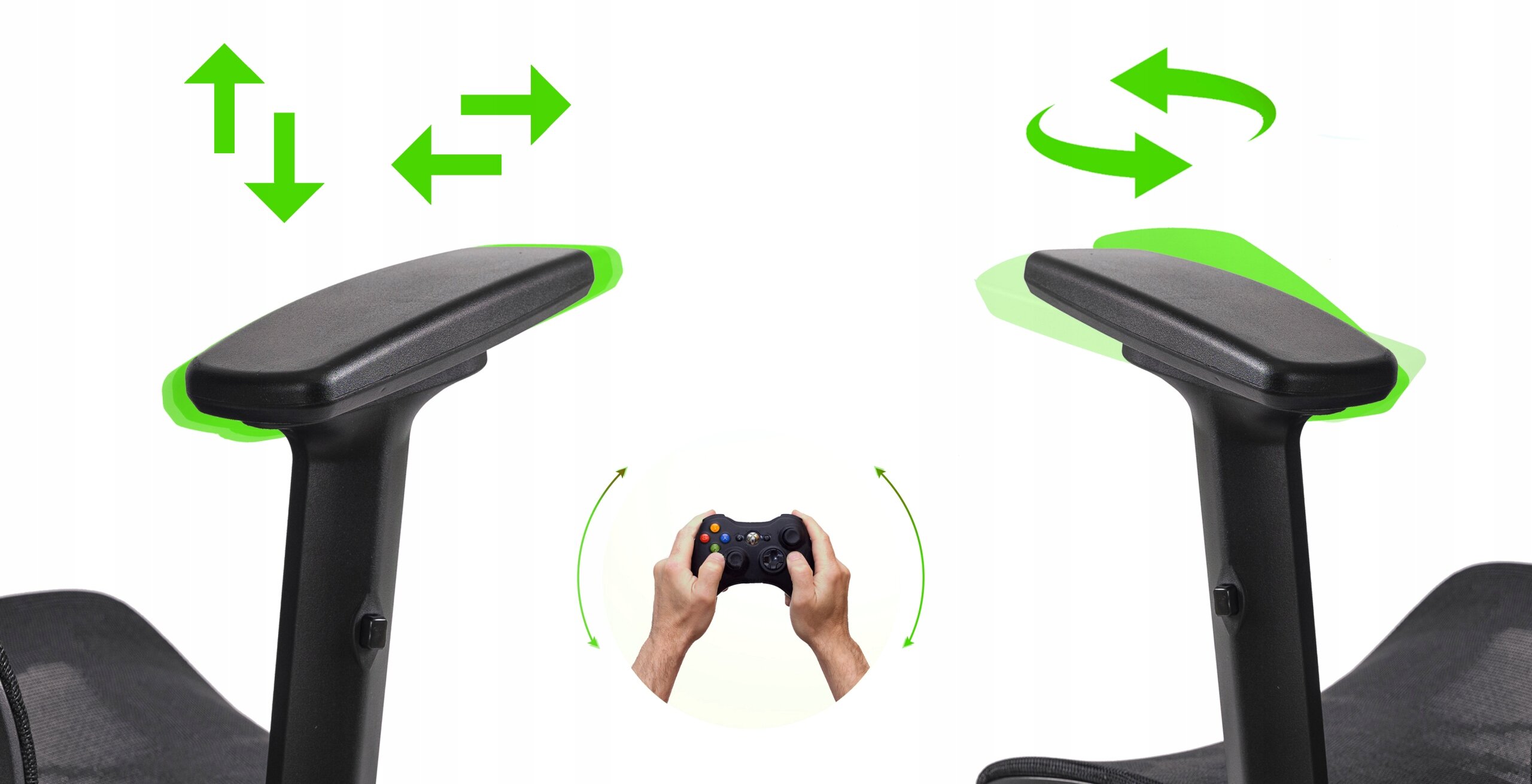 - Przód-tył – przesuwanie podłokietników w zależności od aktywności (np. granie, pisanie, relaks).