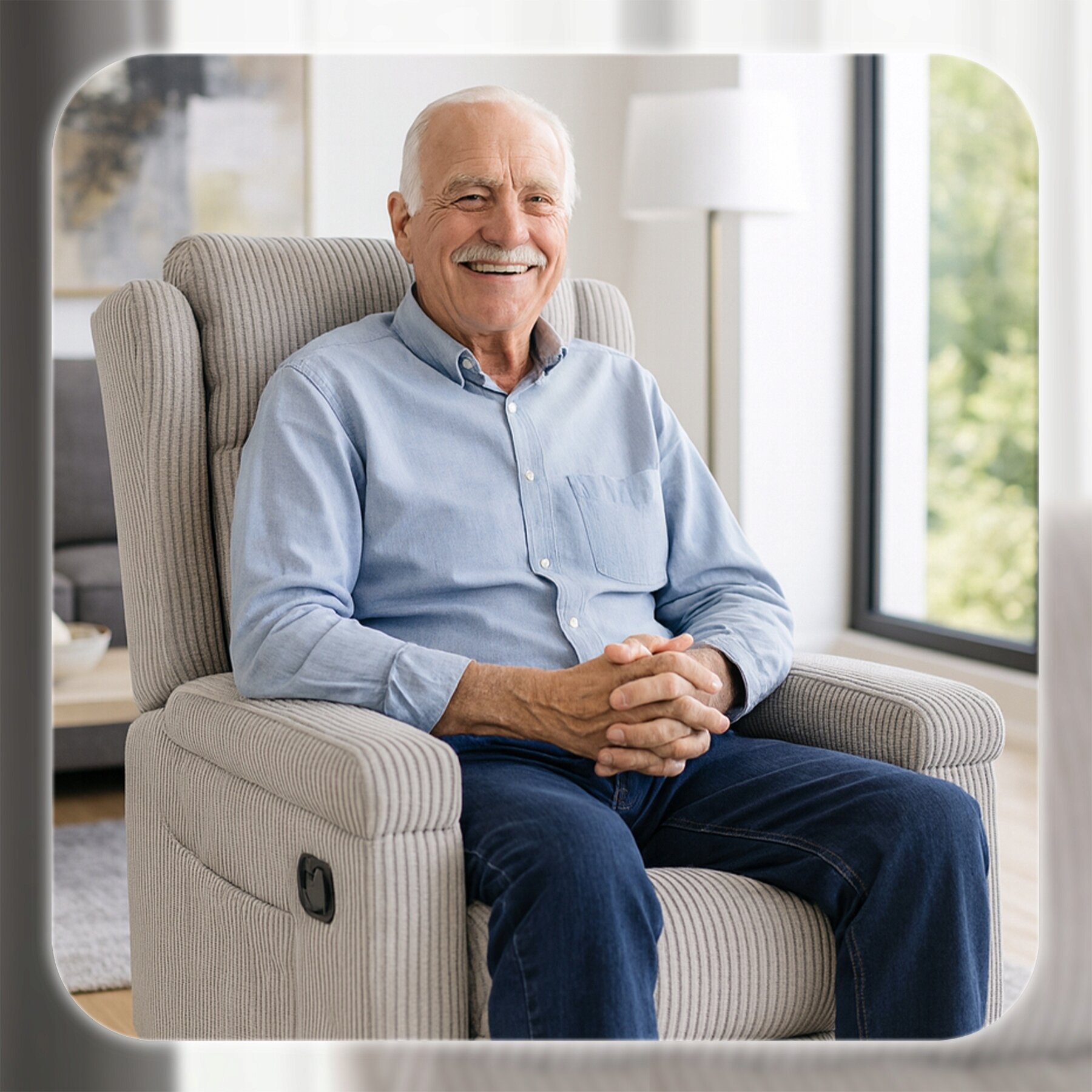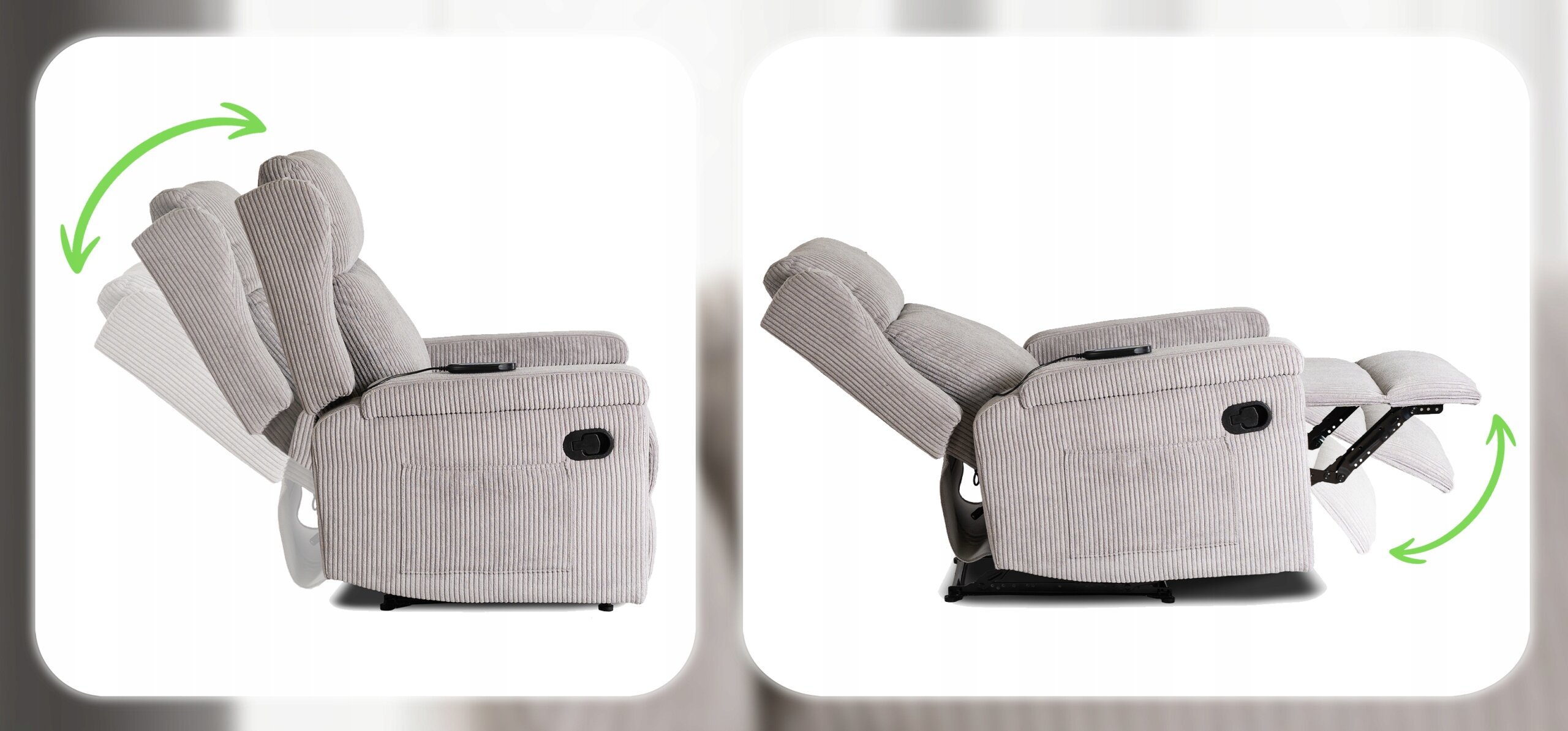 Fotel SEBASTIAN został wyposażony w mechanizm, który umożliwia osobne rozkładanie podnóżka i oparcia. Dzięki temu sam decydujesz, czy chcesz tylko unieść nogi, czy dodatkowo odchylić plecy – pełna swoboda w dopasowaniu pozycji do Twoich potrzeb.