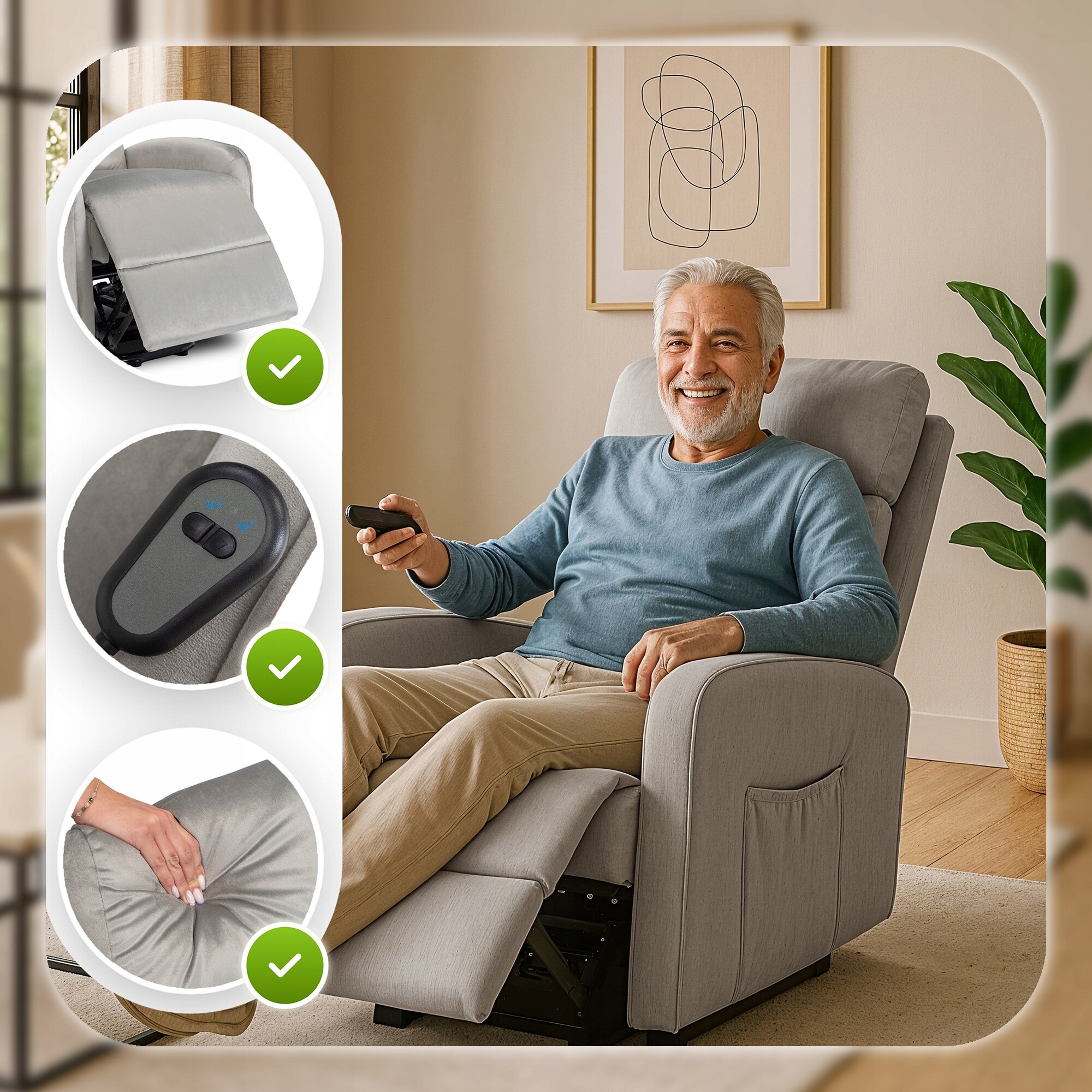 Fotel COLTON w tkaninie w kolorze szarym to idealne rozwiązanie dla osób starszych lub mających trudności ze wstawaniem. Wyposażony w funkcję podnoszenia, ułatwia bezpieczne i komfortowe wstawanie z fotela. Rozkładane oparcie oraz wbudowany podnóżek pozwalają na pełny relaks w pozycji półleżącej lub leżącej. Wszystkie funkcje obsługiwane są wygodnym pilotem, co zapewnia prostotę użytkowania. Miękka, przyjemna w dotyku tapicerka nadaje fotelowi elegancki i przytulny wygląd, pasujący do każdego wnętrza.