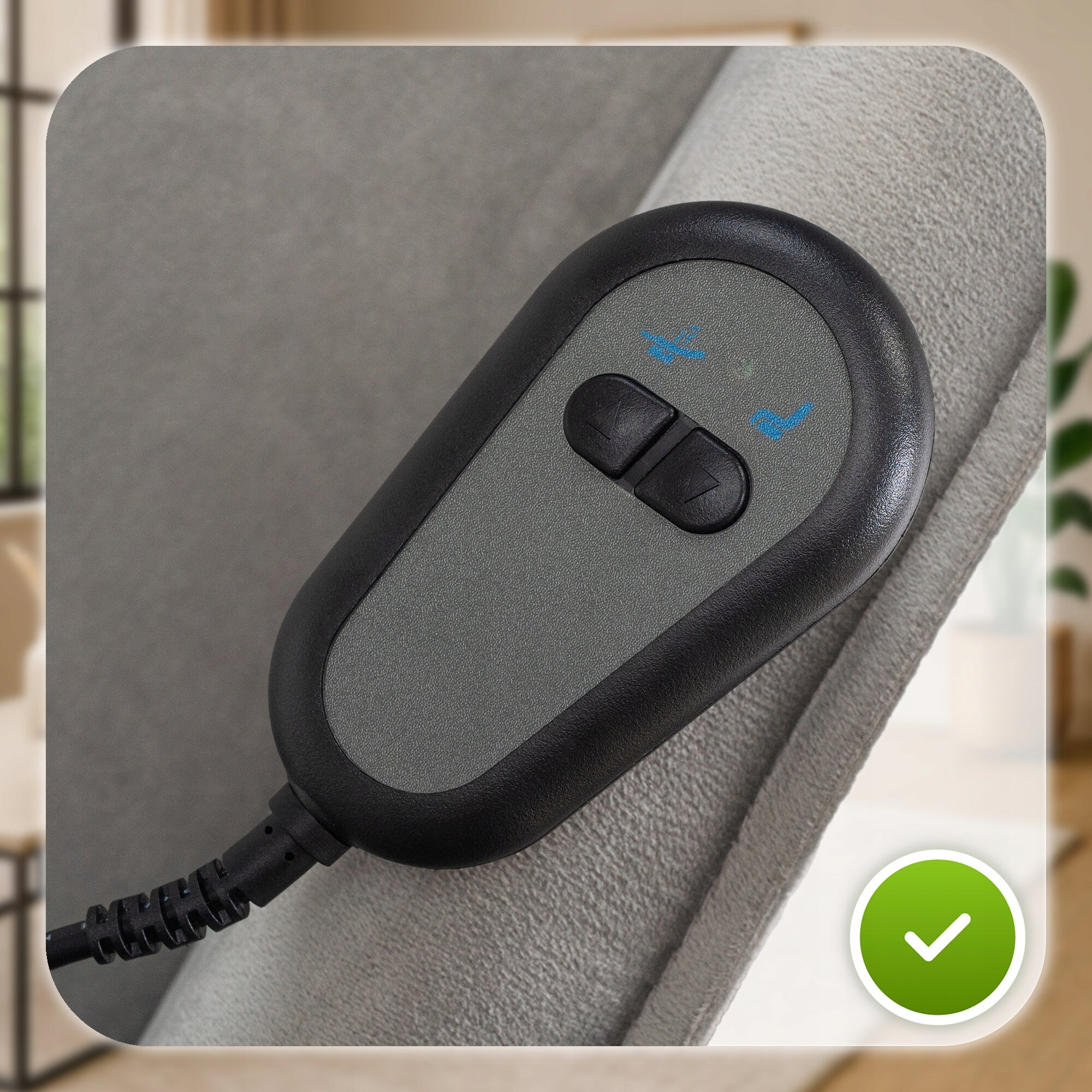 Pilot w fotelu COLTON jest intuicyjny i prosty w obsłudze – pozwala na sterowanie podnoszeniem, rozkładaniem oparcia i podnóżka. Nie posiada funkcji zapamiętywania ustawień, dzięki czemu każdorazowo można dopasować pozycję do aktualnych potrzeb.