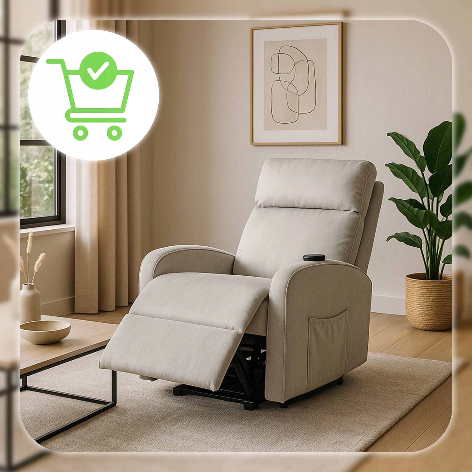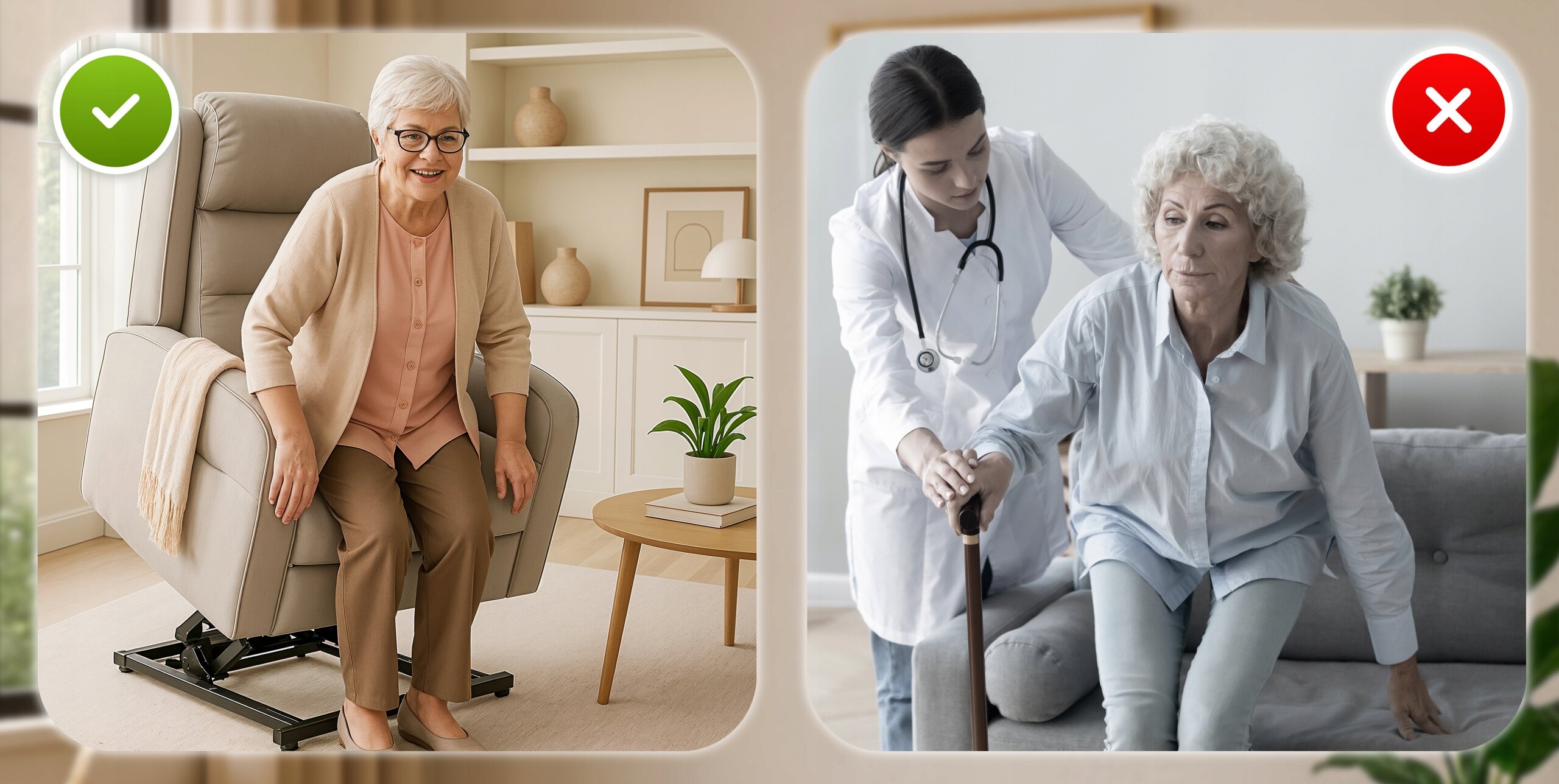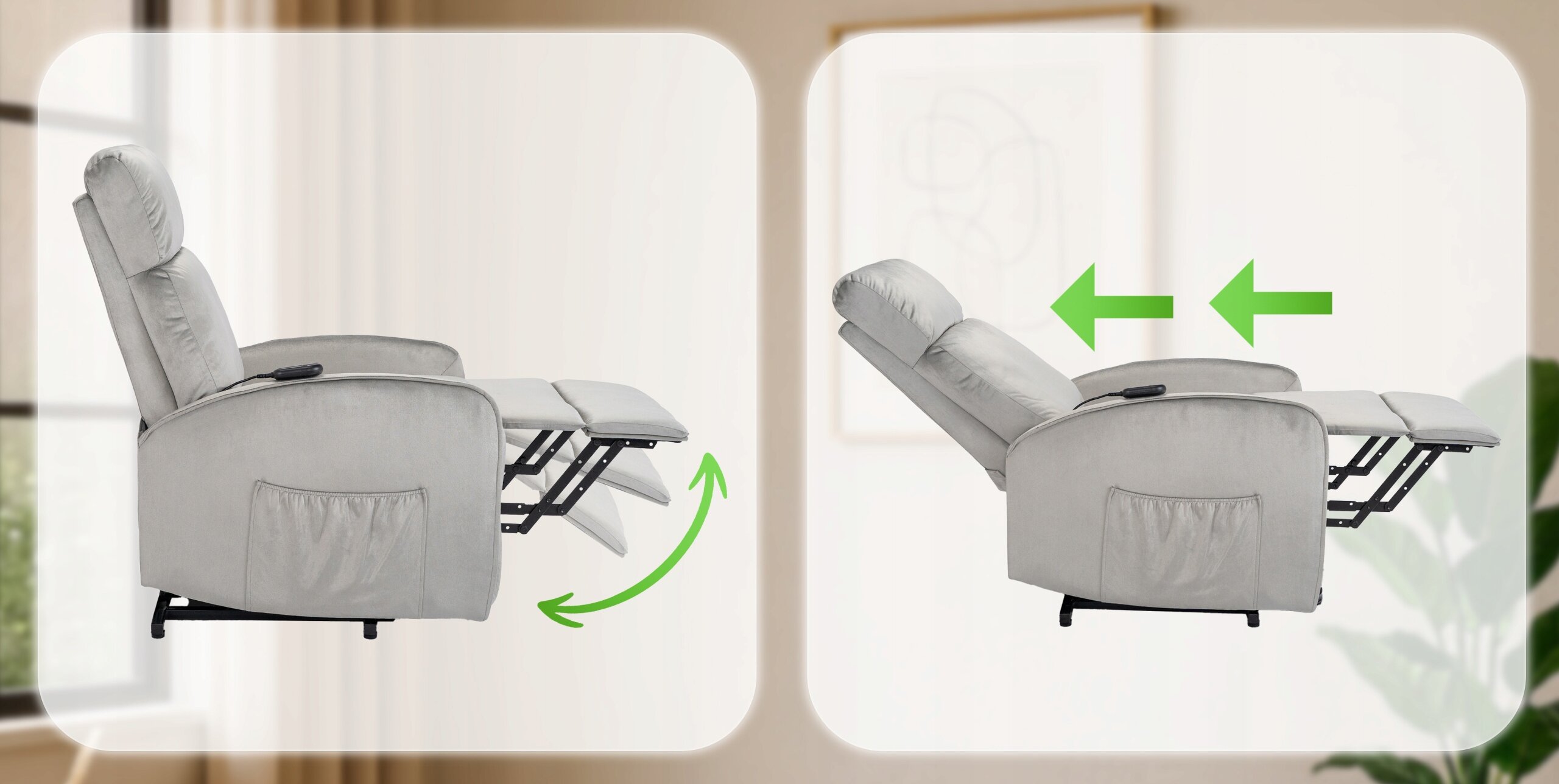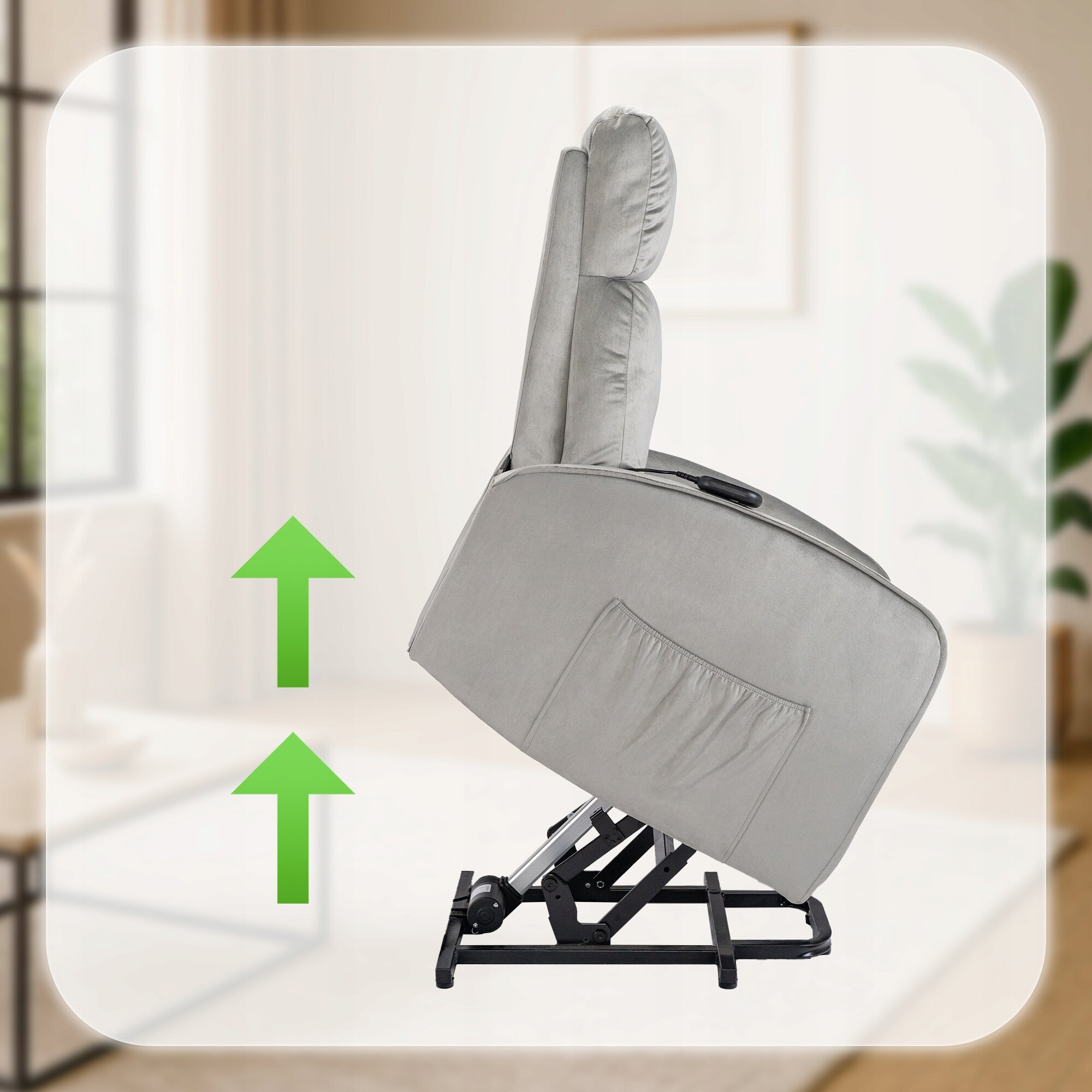 Za pomocą jednego przycisku fotel delikatnie unosi się do góry, pomagając przejść z pozycji siedzącej do stojącej w sposób stabilny i kontrolowany.