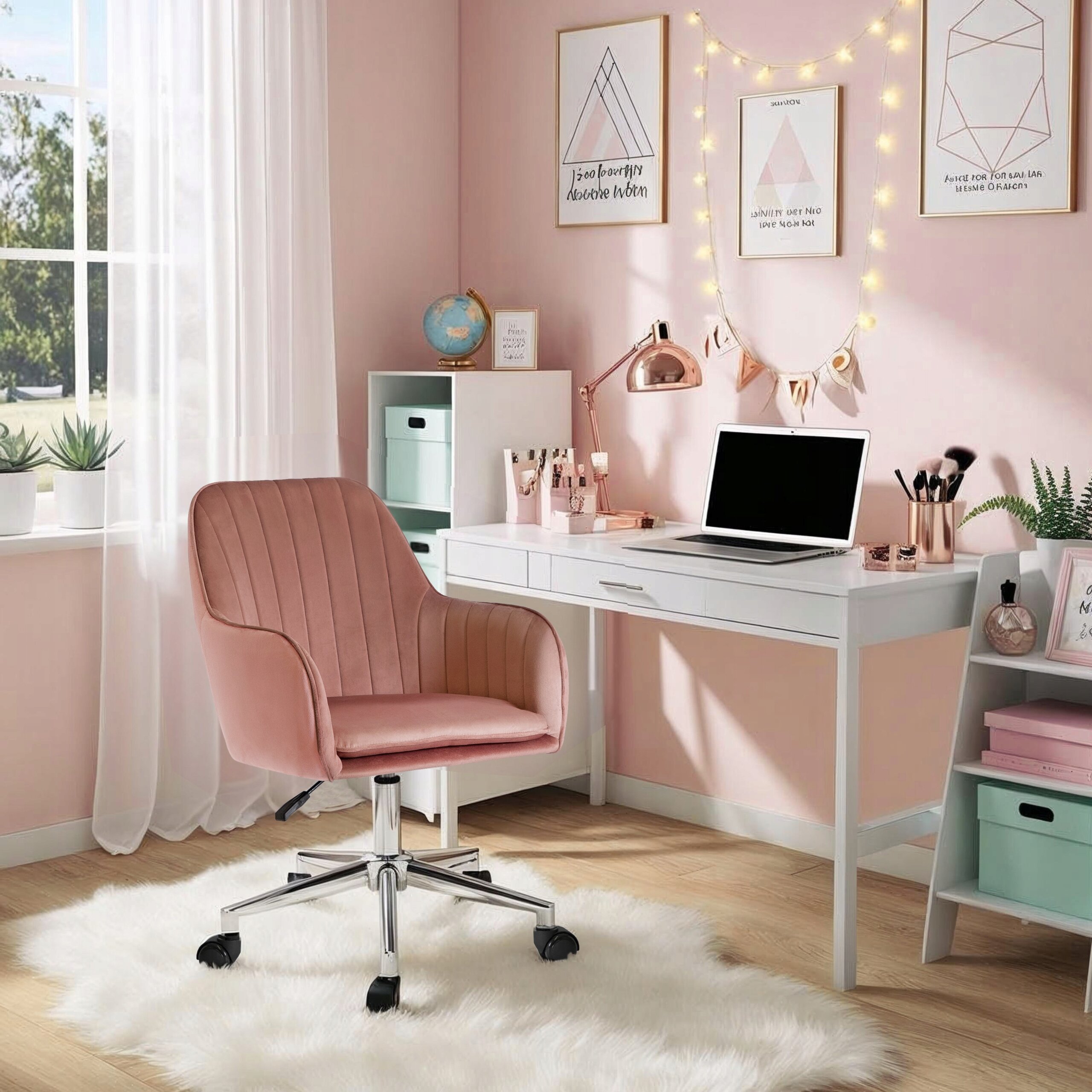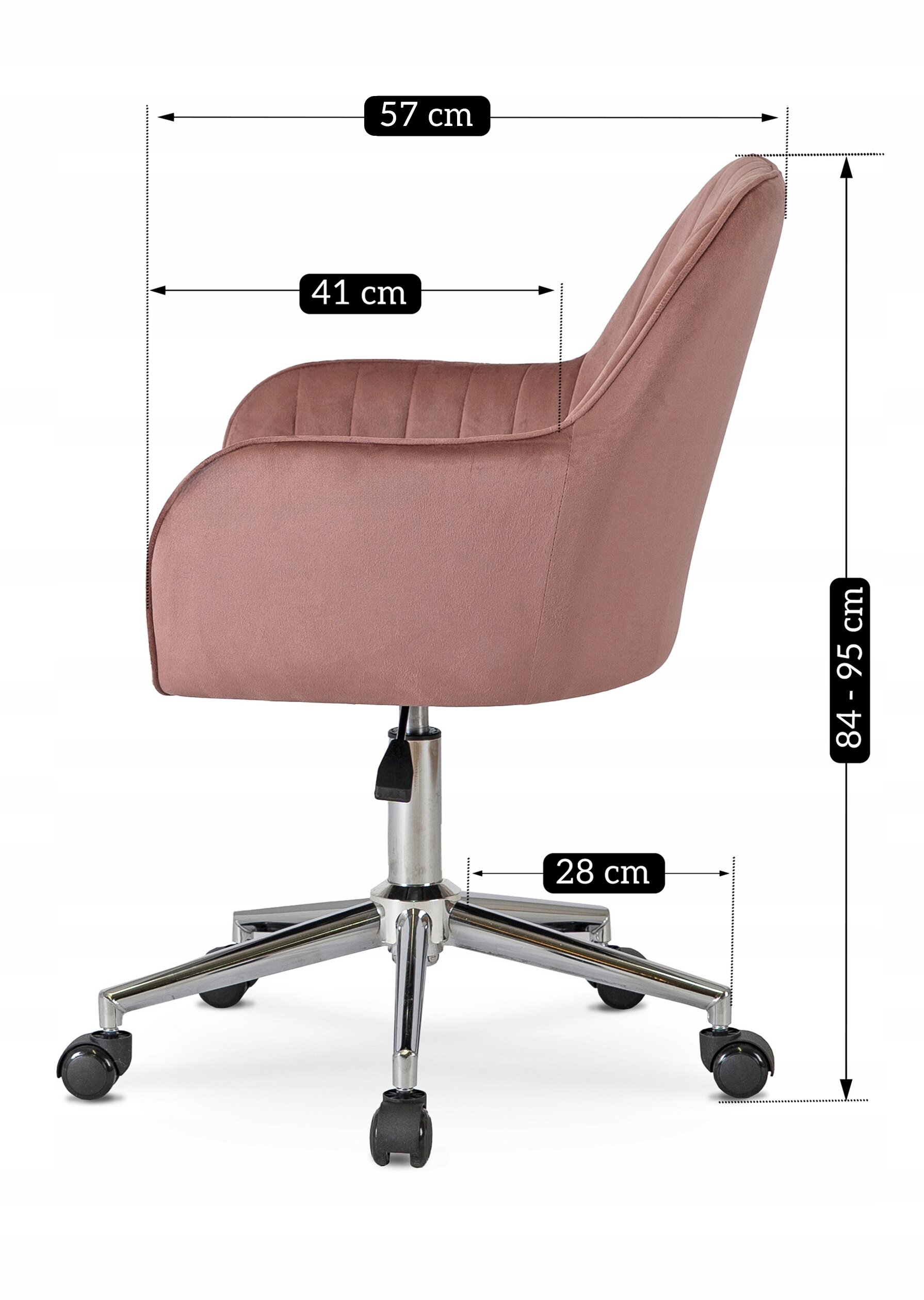 Ten uroczy fotel obrotowy to idealny dodatek do pokoju dziecięcego. Jego welurowa tapicerka w odcieniu pudrowego różu tworzy przytulną, dziewczęcą atmosferę. Kształt oparcia oraz subtelne przeszycia sprawiają, że fotel wygląda stylowo i pięknie.