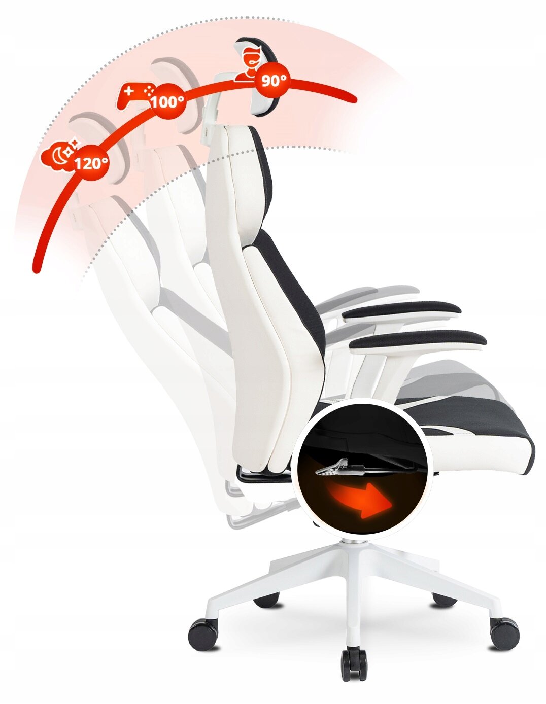 Ponadto pozwoli Ci na odchylenie oparcia z bazowych 90° względem siedziska do 100° i 120° z opcją blokady w takowej pozycji, więc gdy tylko najdzie Cię taka ochota to możesz niemal położyć się w swoim fotelu biurowym.