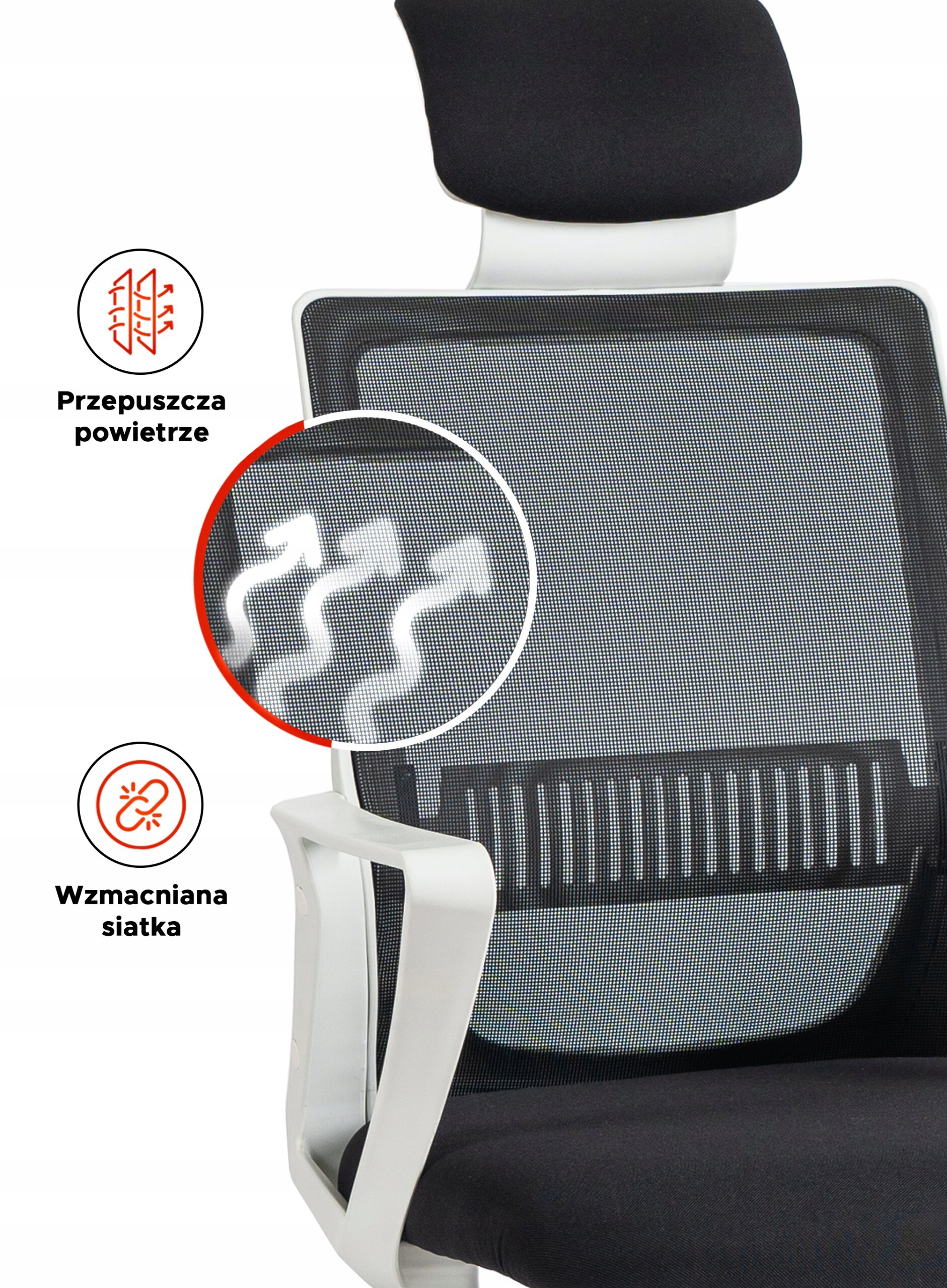 Fotel FLEX posiada na oparciu specjalną mikro-siatkę typu Air Mesh. To dostosowujący się do kształtu sylwetki materiał, który umożliwia też doskonały przepływ powietrza, co sprawdzi się świetnie, szczególnie w cieplejsze dni.
