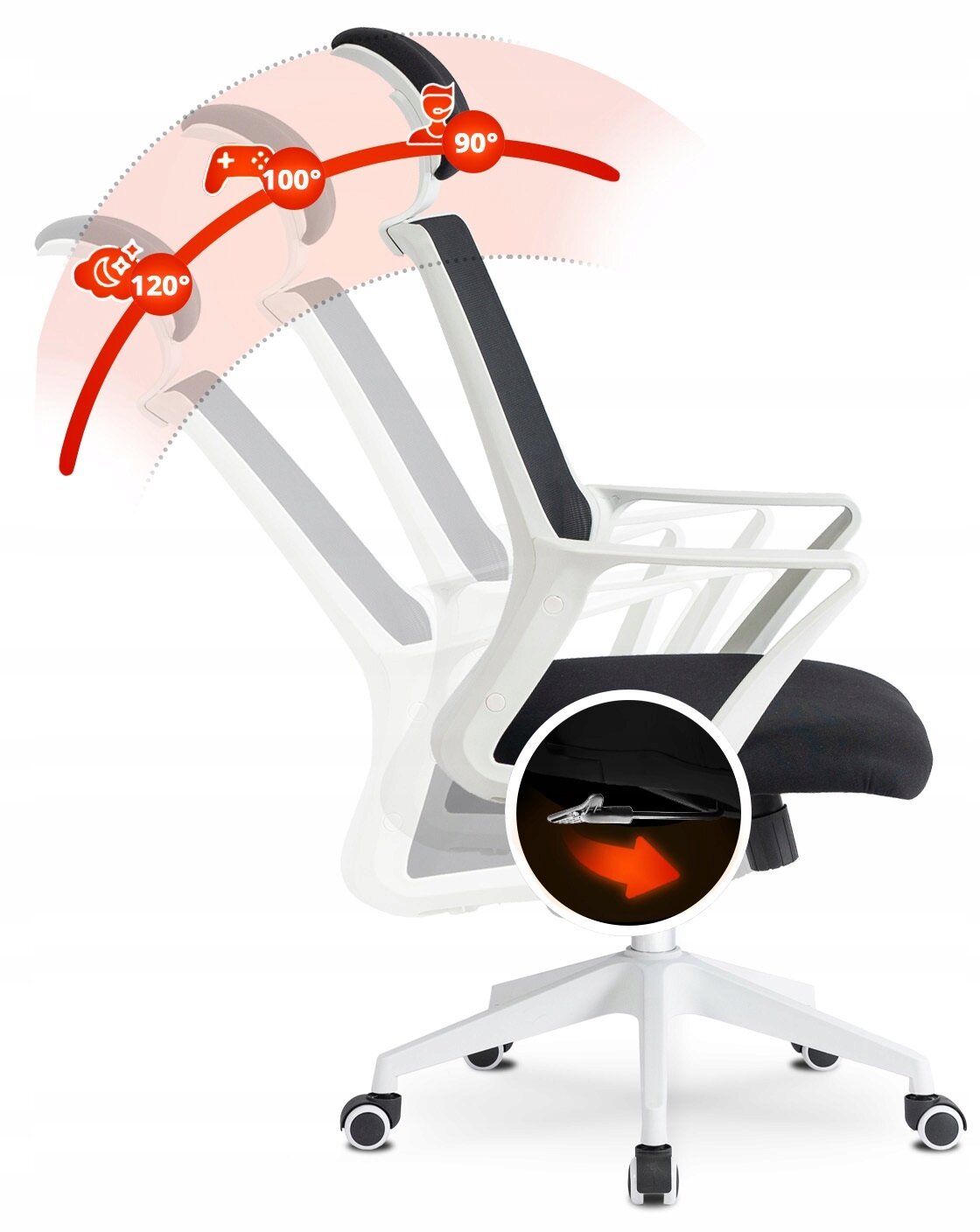 Ponadto pozwoli Ci na odchylenie oparcia z bazowych 90° względem siedziska do 100° i 120° z opcją blokady w takowej pozycji, więc gdy tylko najdzie Cię taka ochota to możesz niemal położyć się w swoim fotelu biurowym.