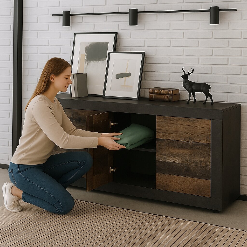 - Dla rodzin z dziećmi – trwałe materiały, bezpieczne krawędzie i łatwe czyszczenie sprawiają, że komoda doskonale sprawdzi się w salonie czy przedpokoju pełnym codziennego życia.
