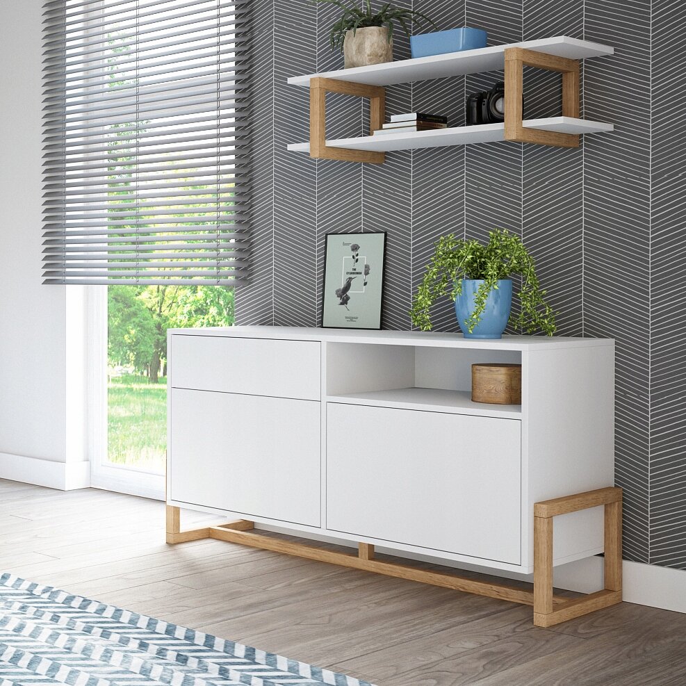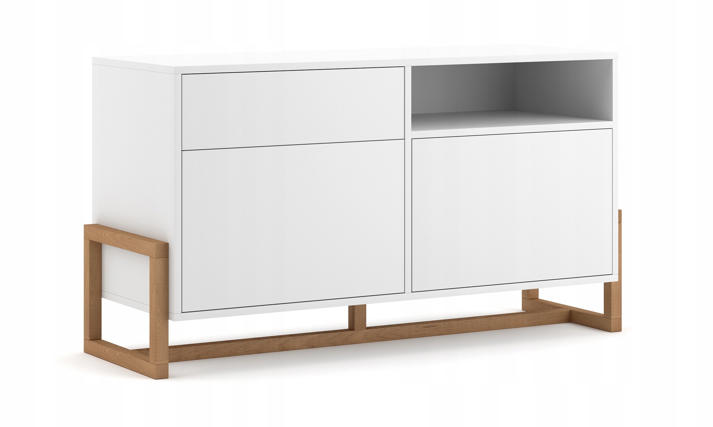 Komoda OSLO to elegancki mebel o wymiarach 119,2 × 42 × 64,7 cm, łączący biały mat z naturalnym drewnem bukowym. Prosta forma i lekka konstrukcja na drewnianej ramie sprawiają, że świetnie pasuje do wnętrz w stylu skandynawskim i nowoczesnym.