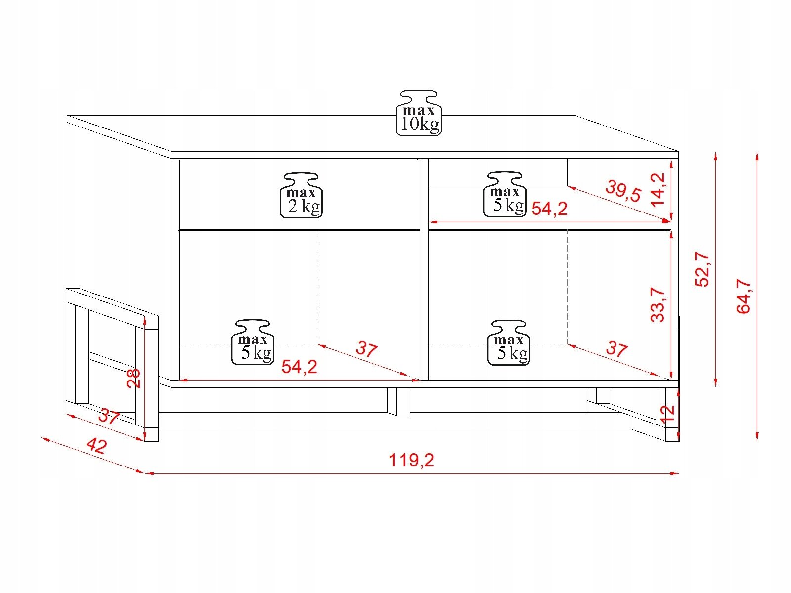 - Wymiary komody: 119,2 × 42 × 64,7 cm