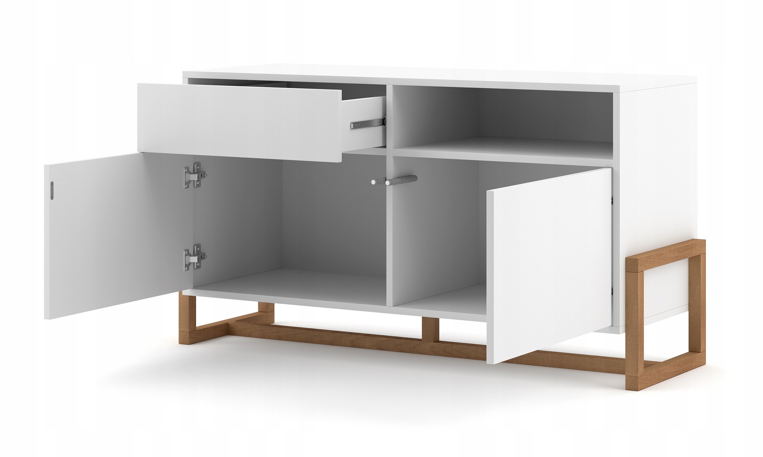 Funkcjonalne wnętrze – komoda oferuje dwie pojemne szafki z półkami, dwie praktyczne szuflady oraz otwartą wnękę, idealną na dekoracje, książki lub sprzęt RTV. Przemyślany układ pozwala na wygodne przechowywanie różnych przedmiotów w jednym miejscu.