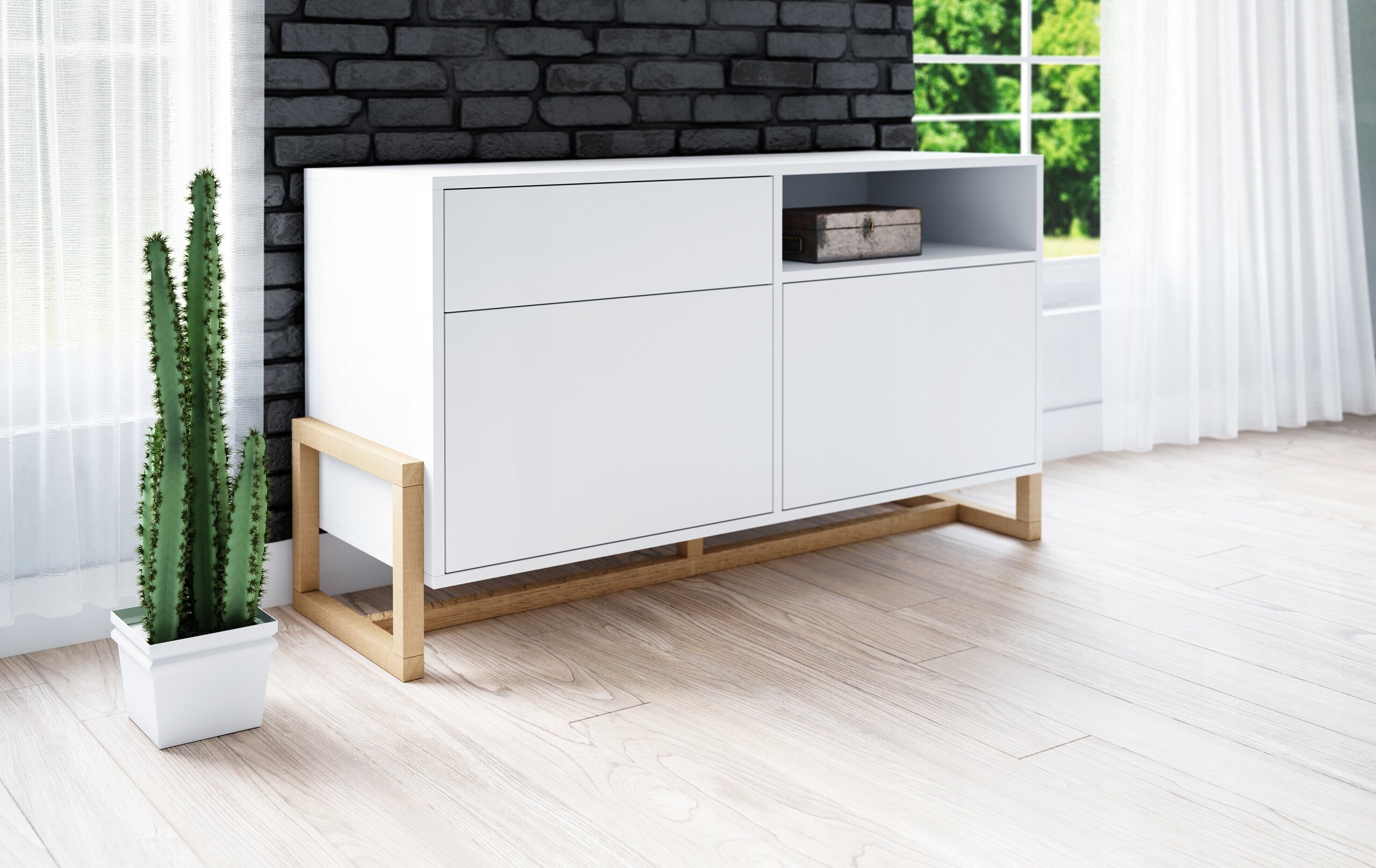 Naturalne wykończenie i solidna podstawa – połączenie białych matowych płyt laminowanych z ramą z litego drewna bukowego tworzy elegancką i trwałą konstrukcję. Lekko uniesiony korpus ułatwia sprzątanie i nadaje meblowi lekkości.