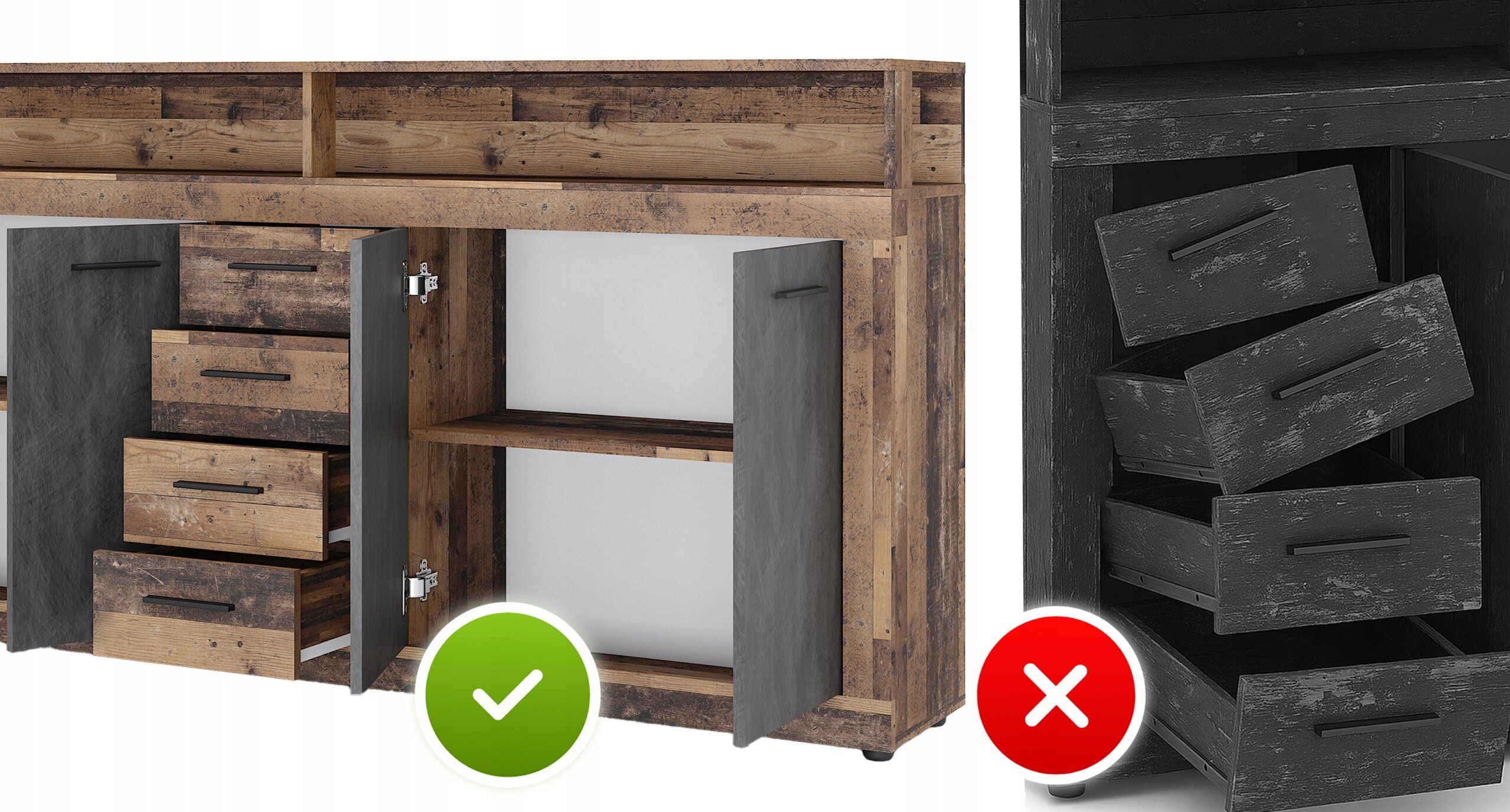 - Pojemne wnętrze z półkami i szufladami – z łatwością pomieścisz odzież, dokumenty, książki lub zastawę stołową. Idealna do organizacji domowej przestrzeni.