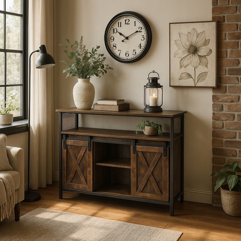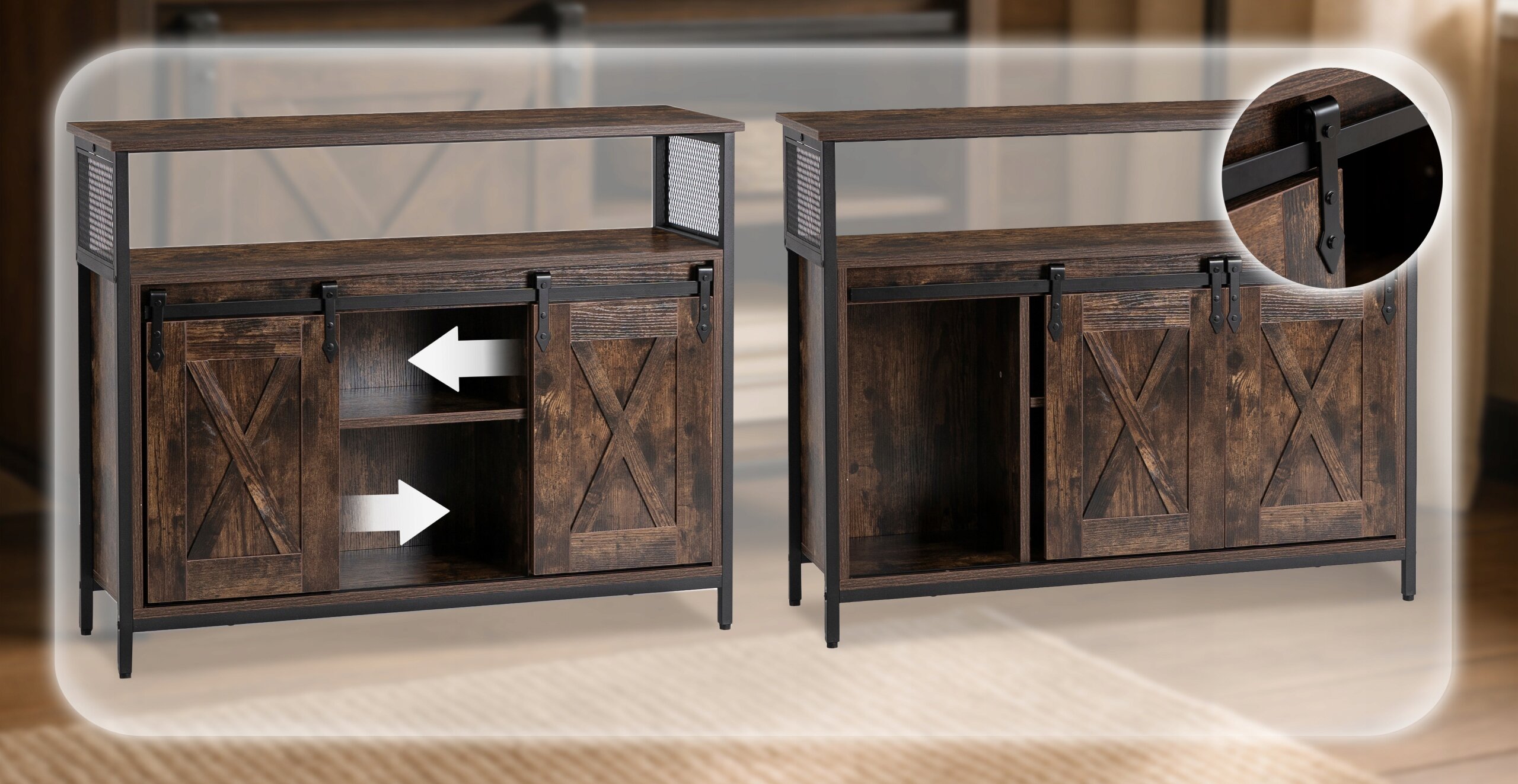 Górny blat świetnie nadaje się na lampkę, rośliny doniczkowe, ramki ze zdjęciami czy ozdobne tace. Przesuwne drzwi i subtelne, czarne uchwyty podkreślają industrialny charakter komody.