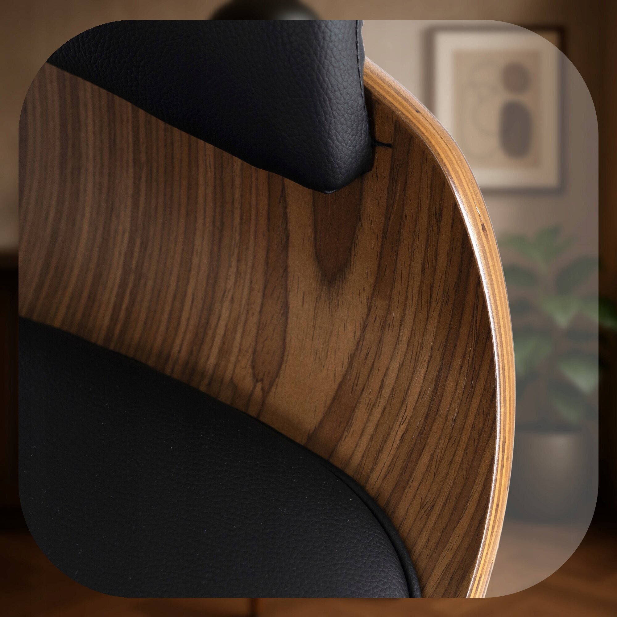 JERSEY to elegancki, obrotowy hoker z giętego drewna. Ma wyprofilowane oparcie oraz miękkie siedzisko, które zapewnia komfort i wygodę. Tapicerowany jest wysokiej jakości ekoskórą w czarnym kolorze, co nadaje mu nowoczesny i stylowy wygląd.