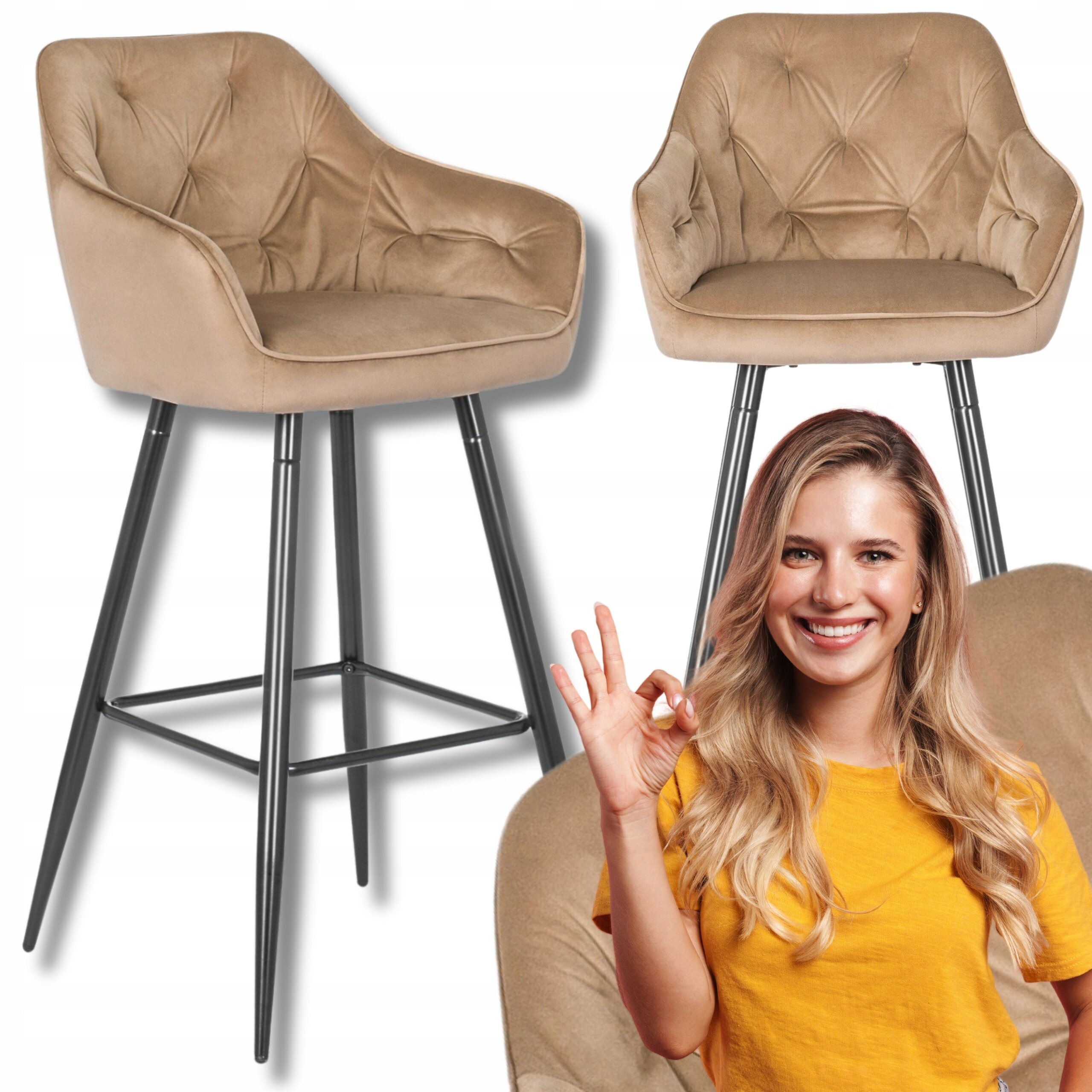 - Hoker Krzesło Barowe Velvet Do Jadalni Welurowy Beżowy SALEM