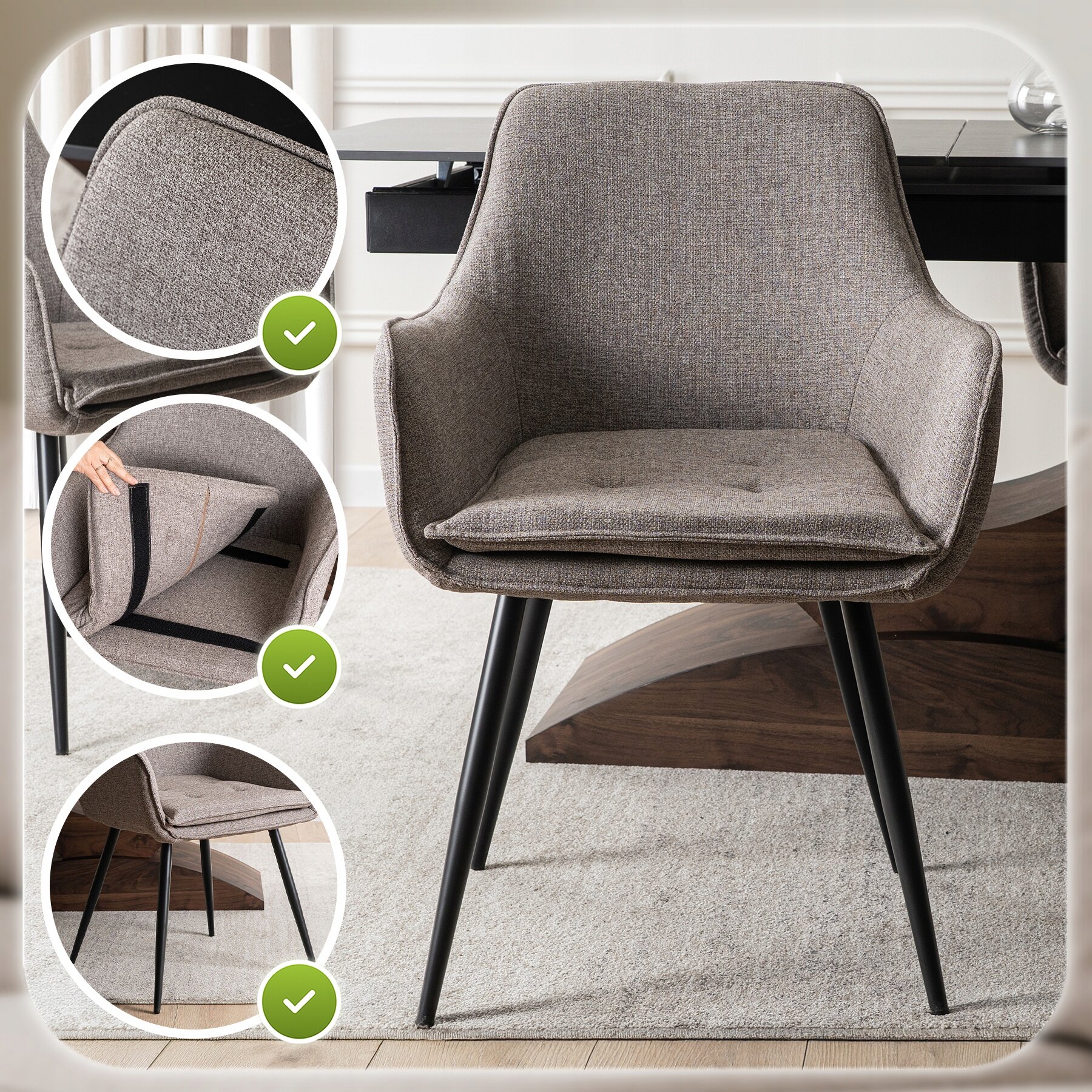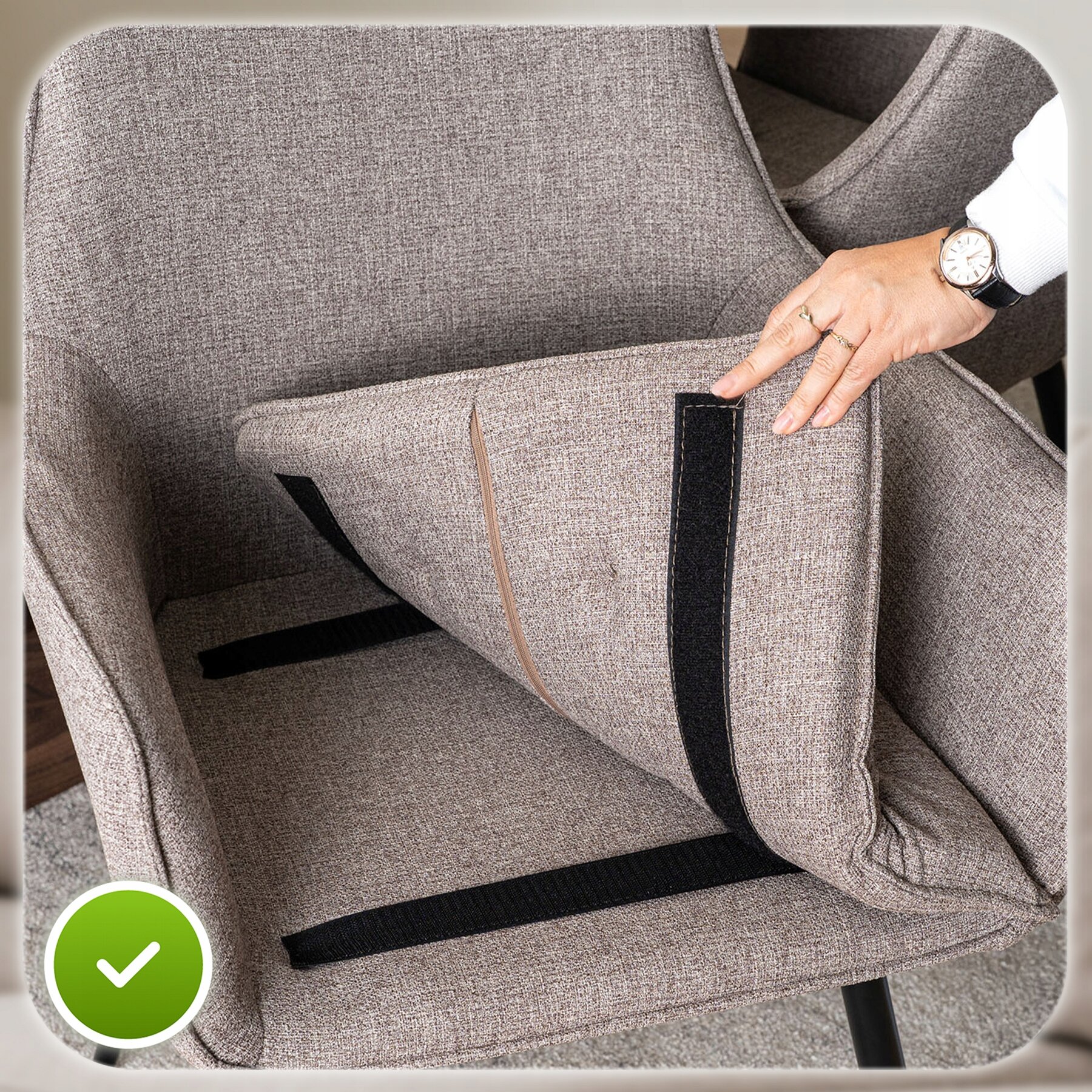 Mocne pasy z rzepami stabilnie trzymają poduszkę w jednym miejscu, zapobiegając jej przesuwaniu podczas siedzenia. Gdy potrzebujesz odświeżyć wnętrze krzesła lub dokładnie wyczyścić tapicerkę – jednym ruchem zdejmujesz poduszkę i gotowe.