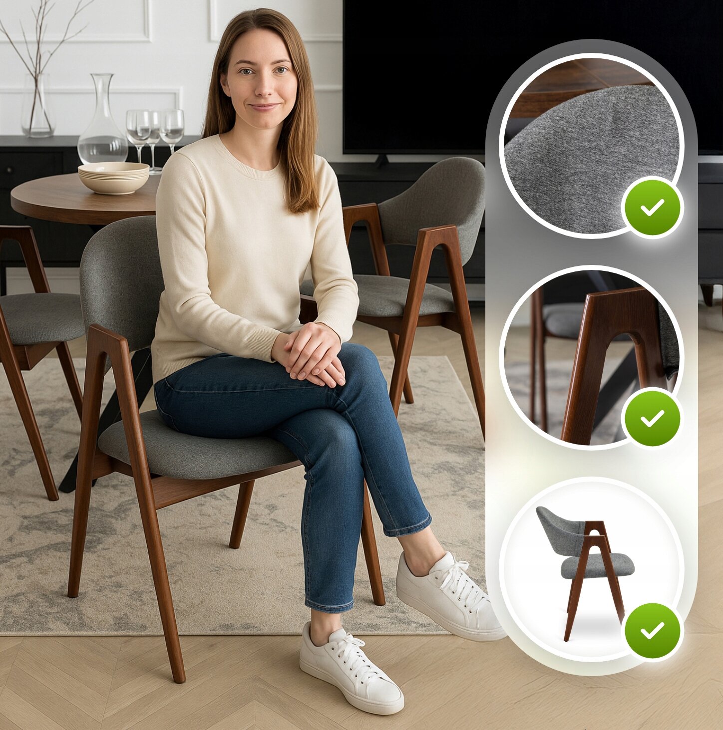 - Wytrzymała tkanina – przyjemna w dotyku, odporna na mechacenie. Dodaje elegancji każdemu wnętrzu.