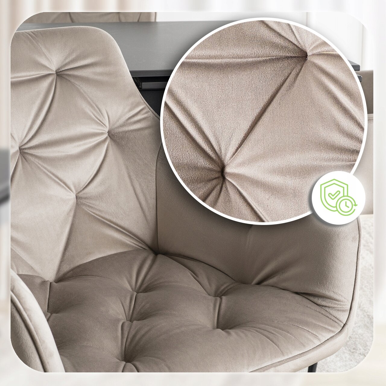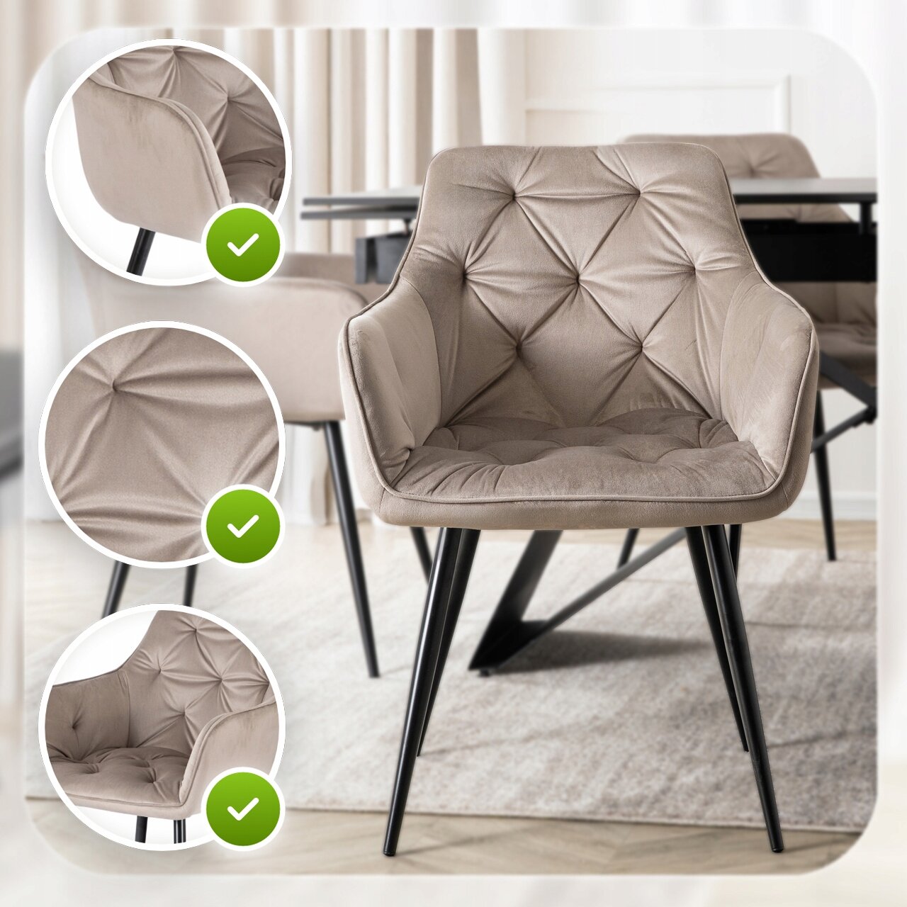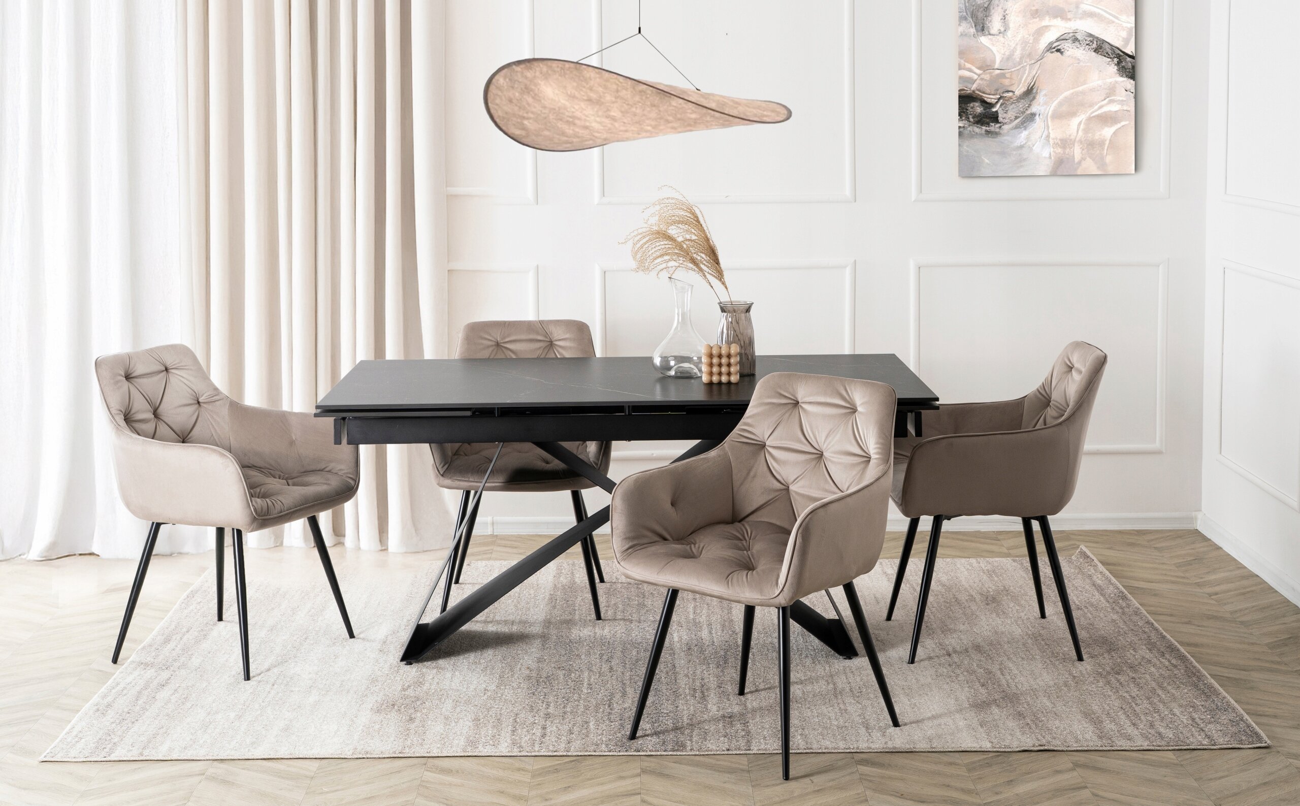 Krzesło MODESTO łączy w sobie wszystko, czego szukasz w idealnym krześle. Zachwyca eleganckim odcieniem beżu, który świetnie komponuje się z każdym wnętrzem – od nowoczesnego po klasyczne. Miękkie, welurowe siedzisko i starannie wyprofilowane, pikowane oparcie gwarantują nie tylko styl, ale też wygodę podczas codziennych posiłków i długich spotkań z bliskimi.
