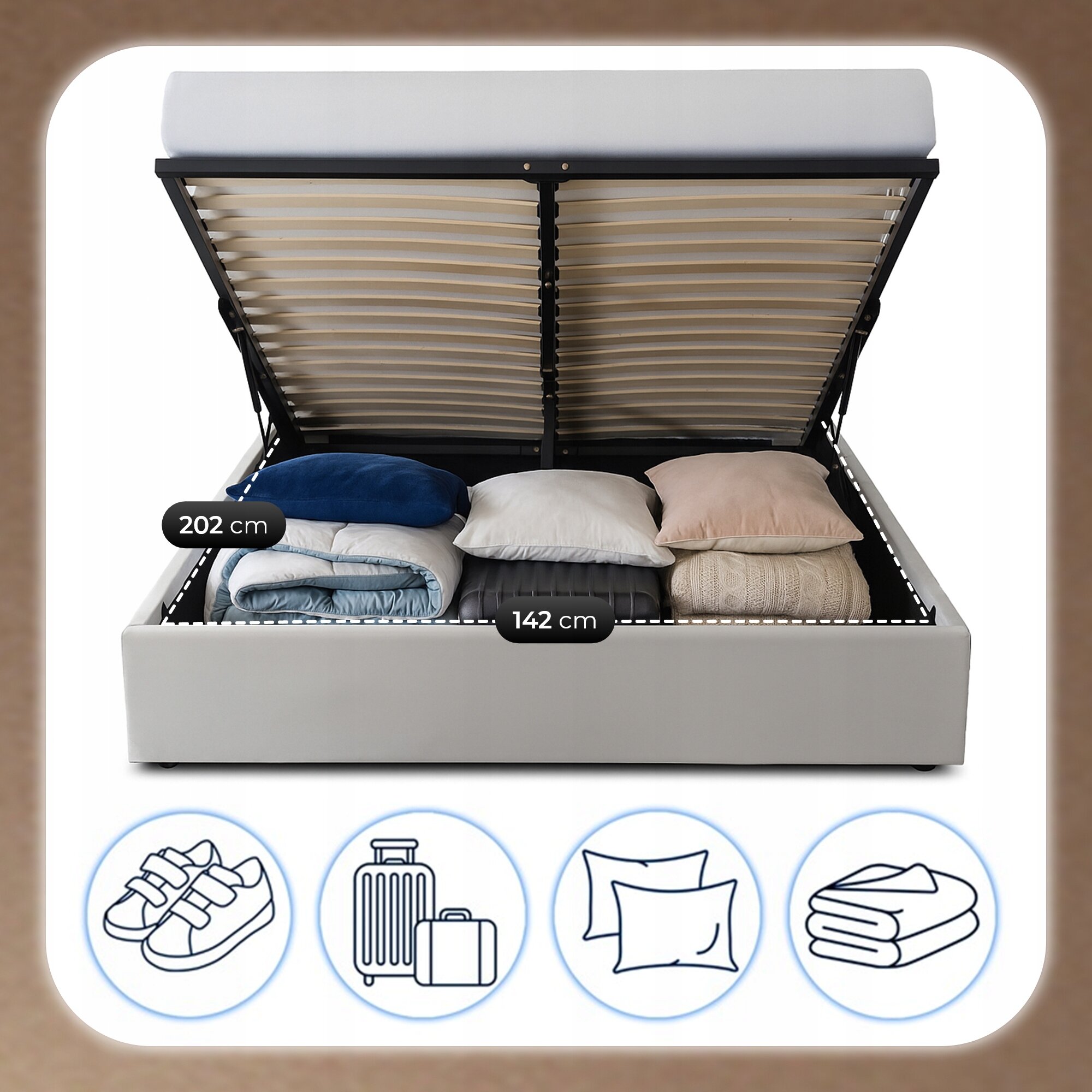 Łóżko kryje w sobie obszerny pojemnik na przechowywanie, który pomieści wszystko, czego potrzebujesz – od kompletów pościeli, przez poduszki i koce, aż po walizki czy sezonowe ubrania. Dzięki wymiarom 202 x 142 cm masz do dyspozycji naprawdę dużą przestrzeń, która pozwoli Ci utrzymać sypialnię w idealnym porządku. To praktyczne rozwiązanie, które sprawdzi się w każdym domu, łącząc funkcjonalność i estetykę.